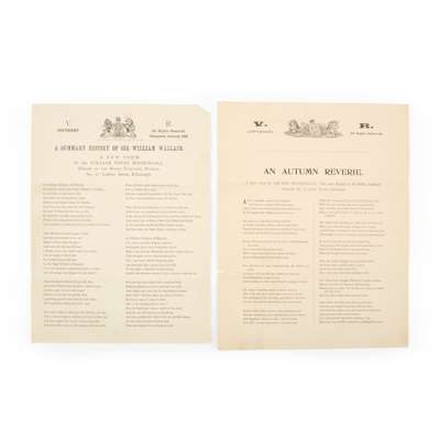 A Summary History of Sir William Wallace. A New Poem [And:] An Autumn Reverie. A New Poem. [Edinburgh, for the author], c.1899-1900. Two printed broadsides (25 x 18.6cm and 26 x 20.4cm), each with the text in two columns and title and royal coat of arms to head, An Autumn Reverie with short nick to edge of one fold (2)