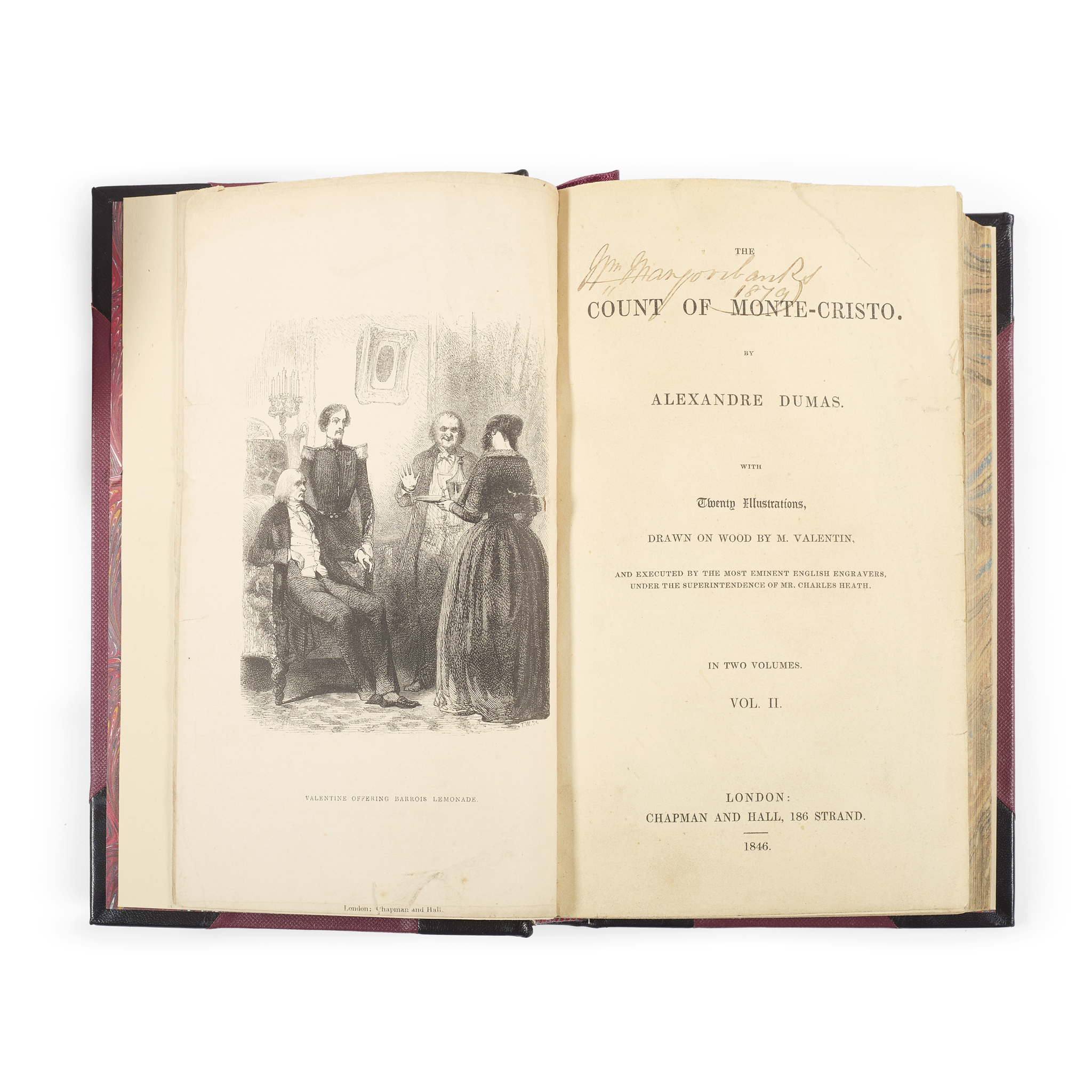 London: Chapman and Hall, 1846. First edition in English, 2 volumes, 8vo (22 x 12cm), iv, 464; iv, 464 p., 20 wood-engraved plates after Henry Valentin, modern half leather binding and slipcase, with marbled pastedowns and marbled fore-edges, wanting title leaf to volume 1 which has been supplied (loose) in facsimile on aged paper, frontispiece to volume 1 has tissue guard, title leaf to volume 2 is slightly torn and creased, but otherwise internally very good, illustrations all present, with ownership inscription of ‘Wm. Marjoribanks’ on title page to volume 2 (2)