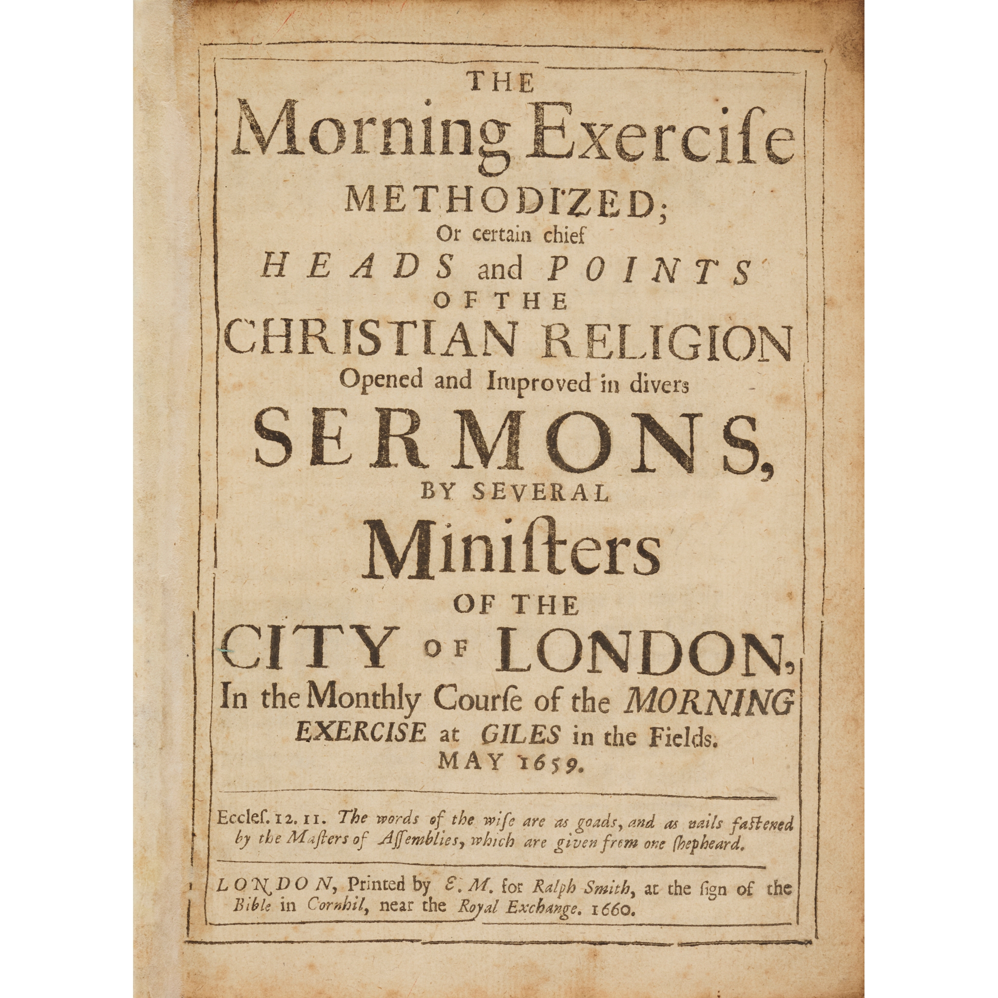 Or Certain Chief Heads and Points of the Christian Religion opened and improved in Divers Sermons, by Several Ministers of the City of London, in the Monthly Course of the Morning Exercise at Giles in the Fields, May 1659. London: E.M. for Ralph Smith, 1660. 4to, recent calf (by the Chelsea Bindery, though unmarked as such), small tear to the corner of 3N3 affecting side-note and part of text, spotting and browning