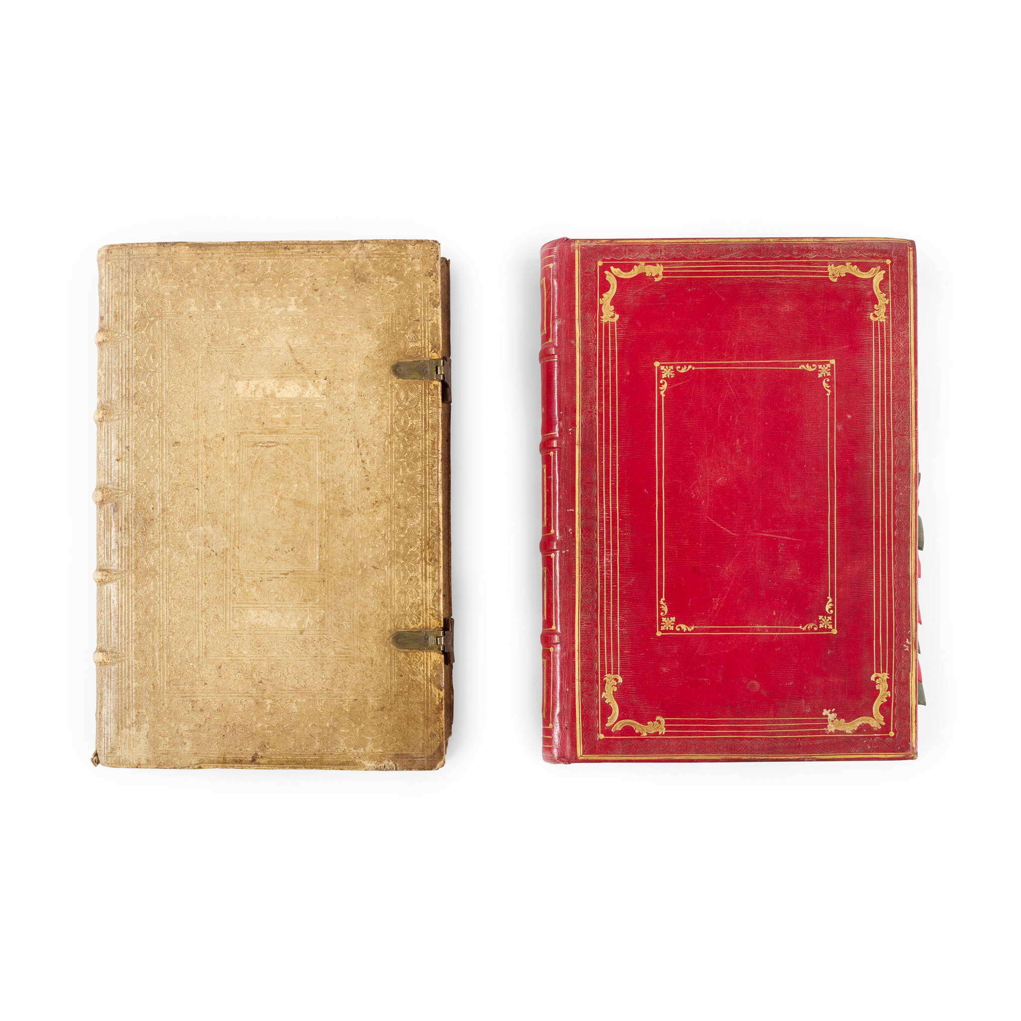 ex decreto sacrosancti concilii Tridentini restitutum, et Clementis VIII auctorirate recognitum, ecclesiis ruralibus praipue accommodatum. Ingolstadt: ex typographia Ederiana, apud Elisabetham Angermariam, viduam, 1618. Folio (33.6 x 22cm), contemporary German blind-tooled pigskin over reverse-beveled wooden boards, engraved brass clasps and catches, edges dyed blue, [4] 558 [1] pp., title-page printed in red and black with allegorical woodcut border and vignette, printed music throughout (on four-line staves), contemporary ownership inscription of one Joseph Anton [?]Schwaiger to front free endpaper, 19th-century gift inscription to front pastedown;