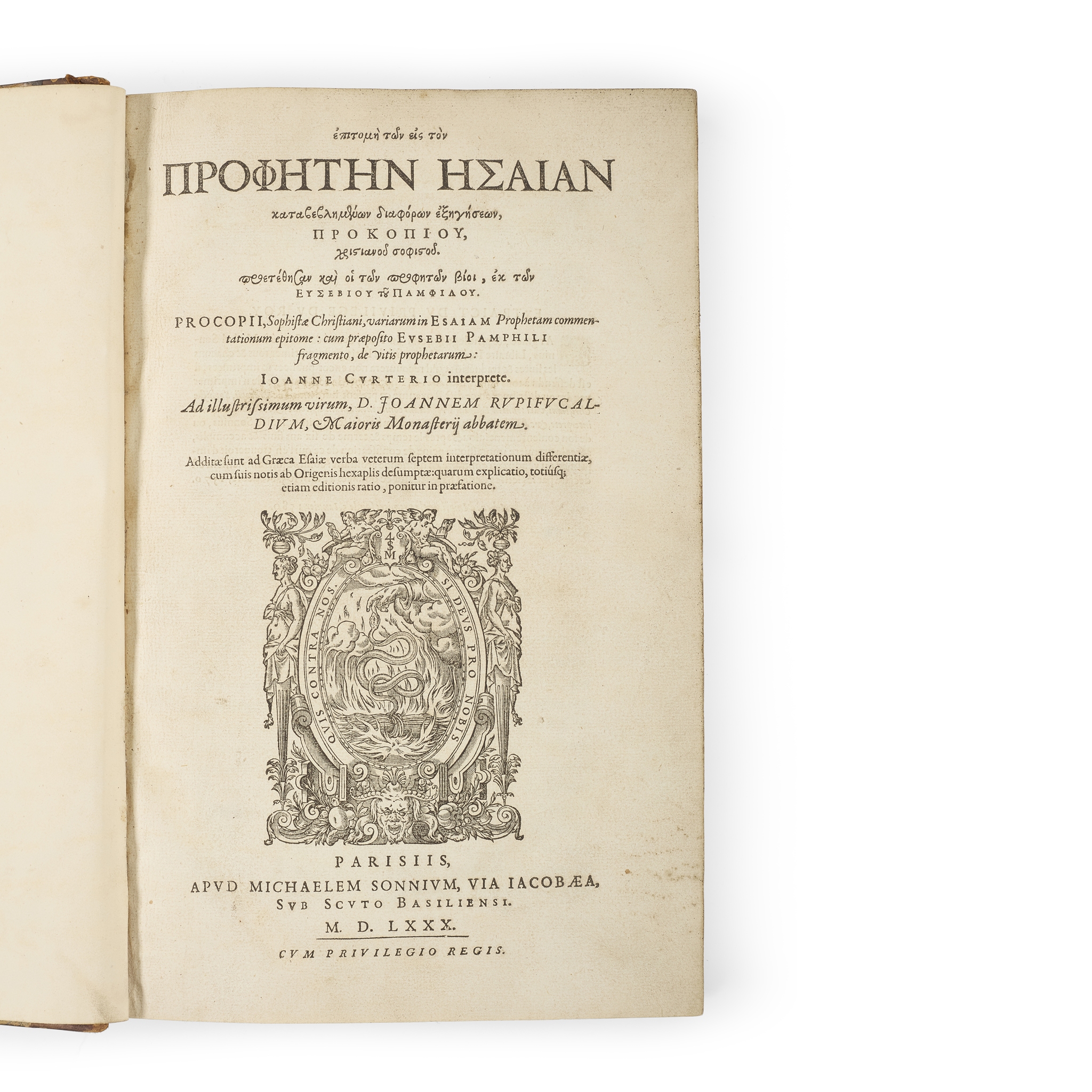 [graece] … Variarum in Esaiam Prophetam commentationum epitome: cum praeposito Eusebii Pamphili fragmento, de vitis prophetarum Joanne Curterio interprete. Paris: Apud Michaelem Sonnium, 1580. Folio (32.7 x 20cm), 19th-century half calf, marbled boards, [40], 764, [38] pp. (wanting final, blank leaf), large woodcut device to title-page, Greek and Latin text in parallel column, joints cracking, corner tips worn [Adams P2155]