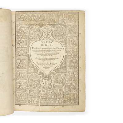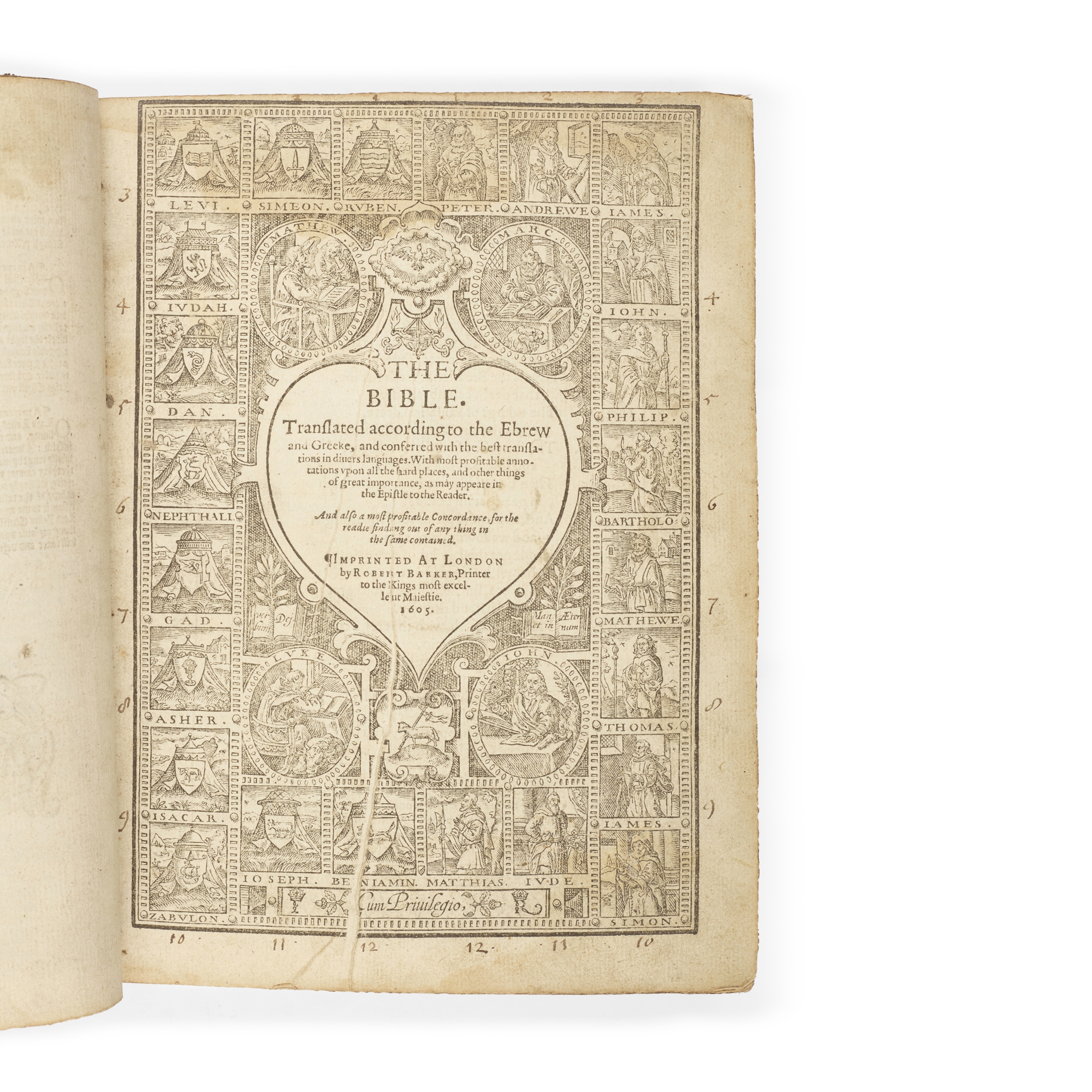 Translated according to the Ebrew and Greeke, and conferred with the Best Translations in Divers Languages. London: Robert Barker, 1605. 4to (21 x 15.4cm), contemporary calf, covers with concentric blind frames enclosing gilt arabesque centrepieces, metal clasps on boards but lacking leather straps, corner tips worn, joints cracked repaired with linen, spine head and tail missing, retaining the general and New Testament title-pages, each comprising letterpress title within cordiform panel surrounded by woodcut portraits of the Apostles and symbols of Old Testament prophets, text in black letter, double column, some light staining throughout, leaf 186 missing bottom right hand corner (repaired with slight loss of text) [ESTC S102028, Darlow & Moule (Rev. 1968), 280].