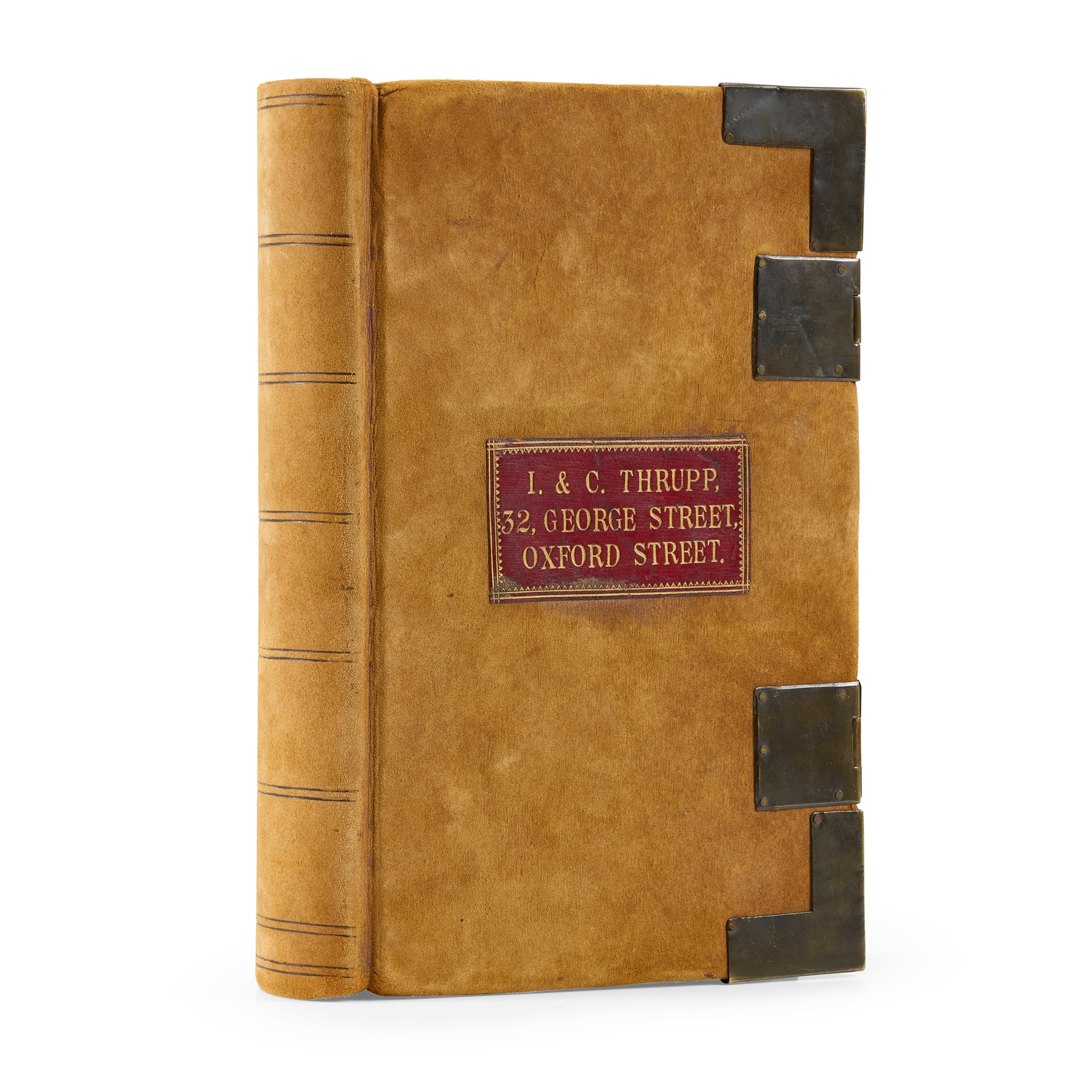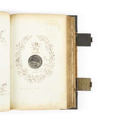 Folio (32 x 19.5cm), contemporary reversed calf, red leather label of J. & C. Thrupp (32 George Street and Oxford Street) to front board, metal corner pieces and clasps, approx. 300 ff., containing some 2,500 pen-and-ink designs of crests and full coats of arms, many designs full-page (usually for peers, e.g. Viscount Palmerston, the Earl of Macclesfield), with detailed annotations throughout denoting tincture, and often the purpose of different designs (e.g. type of coach: landau, dress coach, barouche, etc.), date (from the 1850s), and the name of the bearer (either a full name or a family name only), including British armigers of all ranks (peers, baronets, knights, esquires, soldiers, churchmen, ladies), mainly British but also including the Nawab of Surat (dated 1267 AH, i.e. 1851-2 CE, with his name in Hindustani), Italians (Montefiore, Foggo), etc., erratic foliation, [24] ff. tab-index to front, variable marginal damp-staining and toning