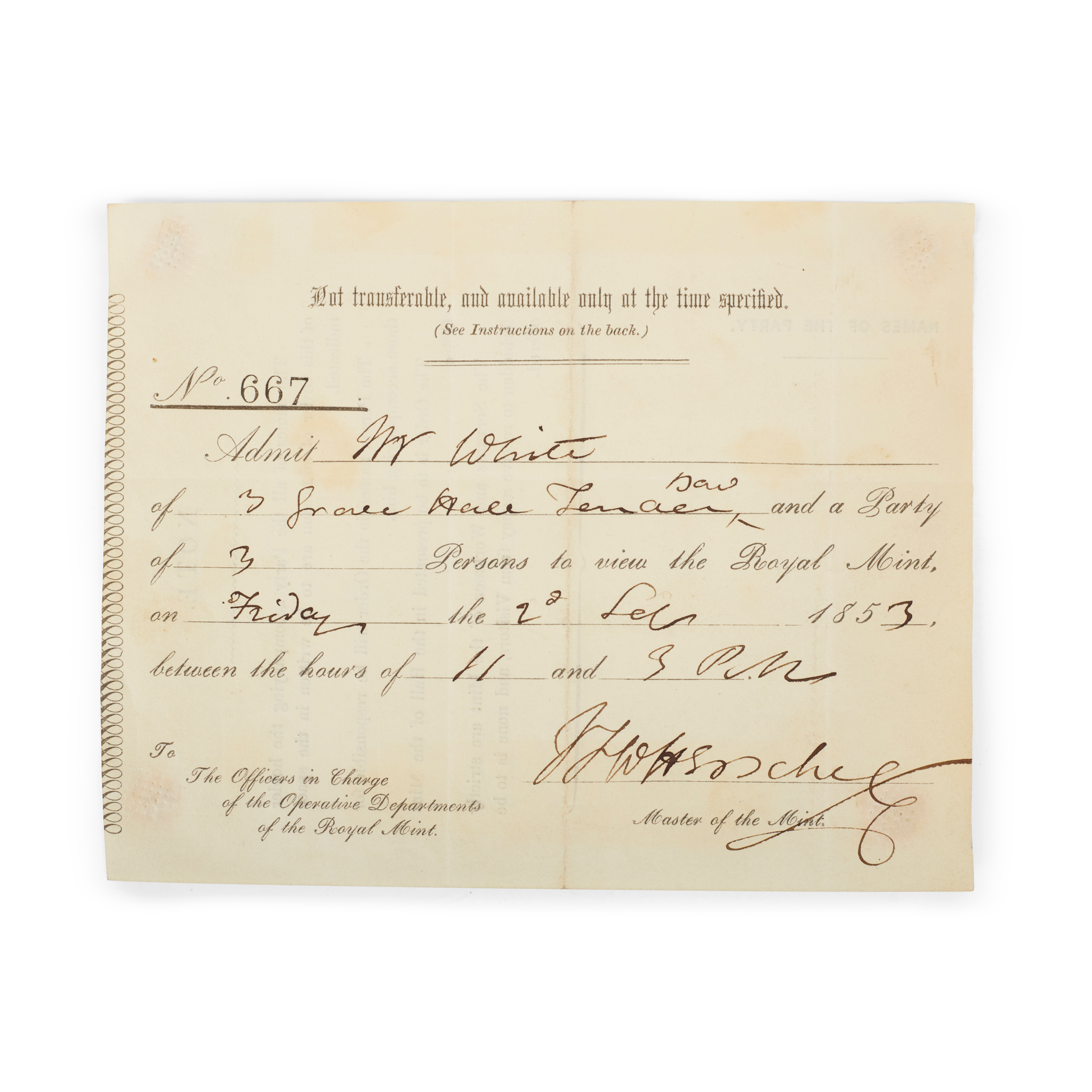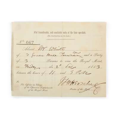 printed admission ticket to the Royal Mint, completed in manuscript, signed by Herschel ('J. F. W. Herschel') as Master of the Mint, 11.8 x 14.8cm, old folds