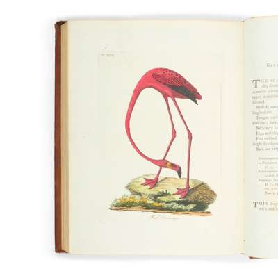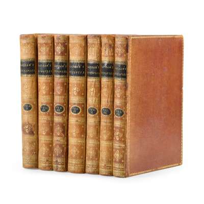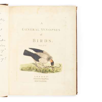 London: for Benj. White, 1781-7. 7 volumes (volumes 1-3, each comprising 2 parts, individually bound, and the first supplement, in 1 volume), 4to (24.5 x 19.5cm), contemporary russia, smooth spines gilt in compartments with peacock motifs and twin black morocco labels, marbled endpapers, 119 hand-coloured engraved plates, some minor spotting in volume 1, staining to the preliminary leaves in volume 3 and title leaf of the supplement, spines slightly worn, corner tips of some volumes bumped, 20th-century pictorial bookplate of M. H. Cockell and bookseller's ticket (G. A. Poynder of Reading) in all volumes, volume 1 with the bookplate and ownership inscription (dated 1915) of J. H. Gurney (British ornithologist John Henry Gurney Jr. (1848-1922)), [ESTC T146461; Mullens and Swann pp. 339-341; Nissen IVB 532; Zimmer II pp. 371-372];