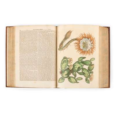 … The Second Edition, Revised and Improved. London: Henry Fisher, n.d. [1824]. 2 volumes, 4to (27 x 20cm), 106 hand-coloured illustrated engraved plates, mainly botanical but also ornamental designs and horticultural buildings, 3 hand-coloured illustrated engraved frontispiece plates, contemporary calf with blind-tooled arabesque motifs, gilt-ruled lines and further blind tooling to edge of boards, raised bands with gilt lines to spines, gilt titles on red and green morocco to spines, additional gilt decoration to heads and tails, edges marbled, owner's plates to front paste downs, foxing to paste downs and some further foxing to leaves and plates, pencil marginalia p. 55, pencil line through, and annotation to, ‘the papaw’ (illustration) facing p. 98, plate facing p. 336 bound-in upside down, pencil annotation to plate facing p. 342, boards scuffed, split to rear joint of volume I, edges and corners rubbed (2)