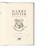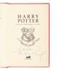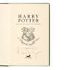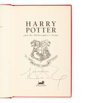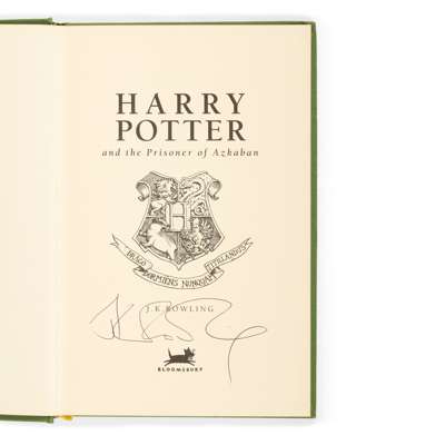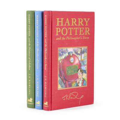 Harry Potter and the Philosopher's Stone; Harry Potter and the Chamber of Secrets; Harry Potter and the Prisoner of Azkaban. London: Bloomsbury, 1999. First deluxe editions, third, first and second impressions, each work signed by J. K. Rowling on the title-page in black ink, 8vo, original red, blue and green cloth, lettered in gilt and with pictorial onlays to front boards, all edges gilt, textblocks toned as usual