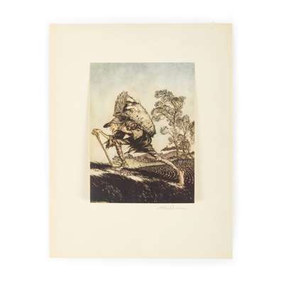 and Other Tales by the Brothers Grimm. London: Constable & Co. Ltd., 1917. First Rackham edition, deluxe issue, one of 525 copies signed by Rackham and with an extra colour plate also signed by him on mount (loose in envelope as issued), 4to, original grey cloth, spine lettered in gilt, front board with gilt title and vignette on white ground, top edge gilt, others untrimmed, 13 tipped-in colour plates with laid-in tissue-guards, covers rubbed, small tide-mark to head of rear board, tissue-guards offset and occasionally chipped, envelope with chips and splits
