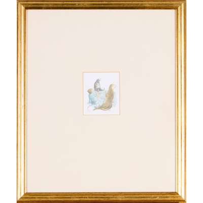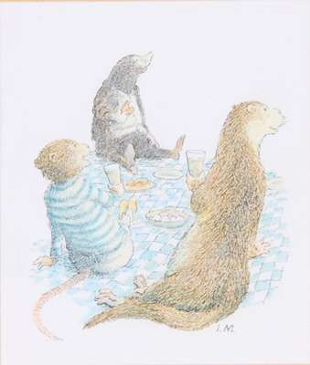 Ratty's picnic with Mole and Otter. Pen, ink and watercolour, initialled lower right (n.d.), mount aperture 9 x 7.5cm (frame 44 x 36.5cm) (2)