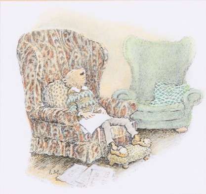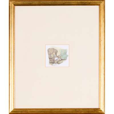 Ratty asleep in an armchair. Pen, ink and watercolour, initialled lower right (n.d.), mount aperture 9 x 9cm (frame 44 x 36.5cm);