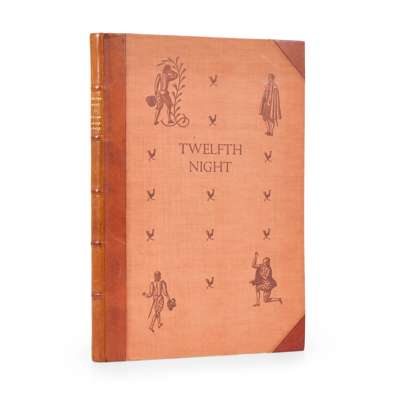 or, What You Will by William Shakespeare. With Engravings by Eric Ravilious. Waltham Saint Lawrence: Golden Cockerel Press, 1932. One of 275 copies, folio, original orange half morocco by Sangorski & Sutcliffe, top edges gilt, others untrimmed, colour-printed wood-engravings by Ravilious throughout, engraved bookplate