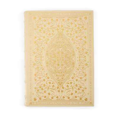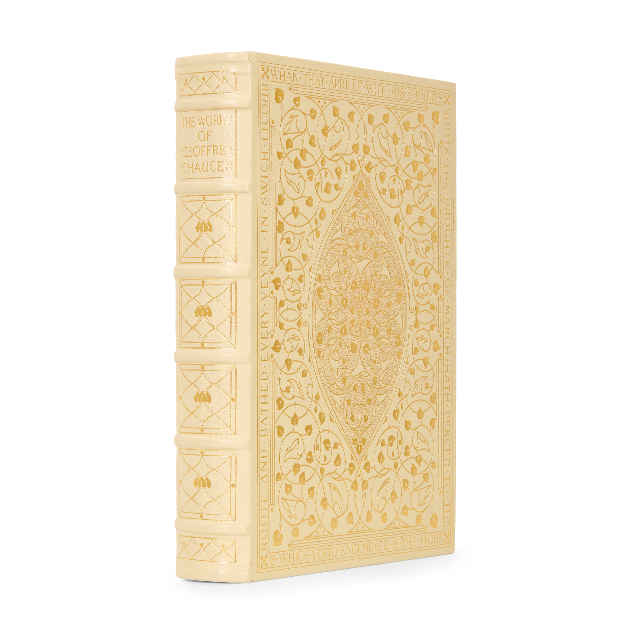 London: Folio Society, 2002. Facsimile edition of the Kelmscott Chaucer, one of 1,010 copies, folio, original cream Nigerian goatskin lettered and decorated in gilt after a design by T. J. Cobden-Sanderson for the Doves Bindery, housed in original solander box with pocket to inside front cover containing The Kelmscott Chaucer: an Essay by William S. Peterson (8vo, original wrappers), solander box with bumping to corners and uneven sunning to front cover