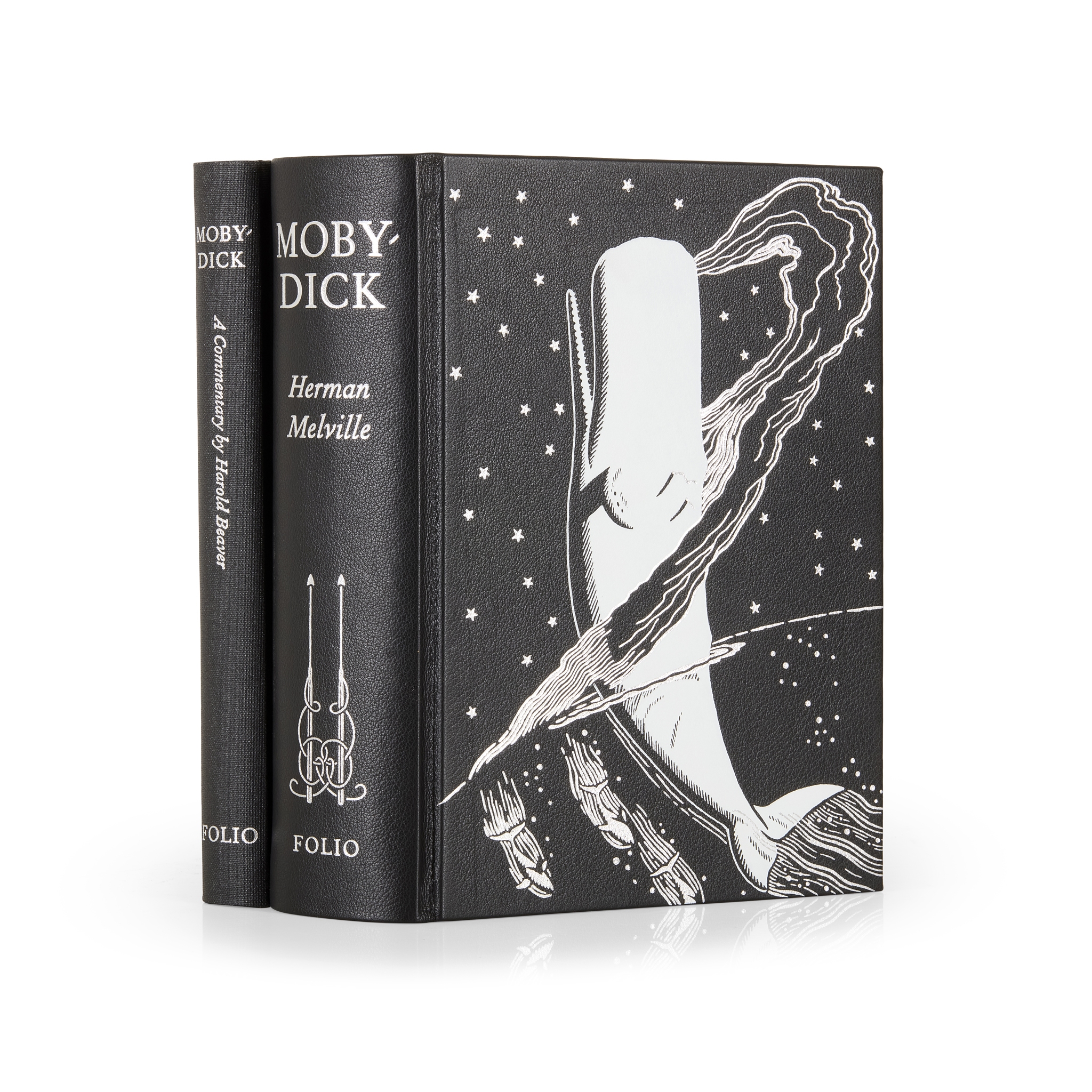 or The Whale. Herman Melville. Illustrations by Rockwell Kent. London: Folio Society, 2009. Limited edition, one of 1,750 copies, 2 volumes, 8vo, main text volume in original black morocco blocked with a design after Rockwell Kent in white and silver, top edge silver, illustrations throughout, commentary volume in original black boards, housed together in original solander box lettered in silver