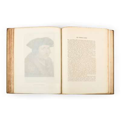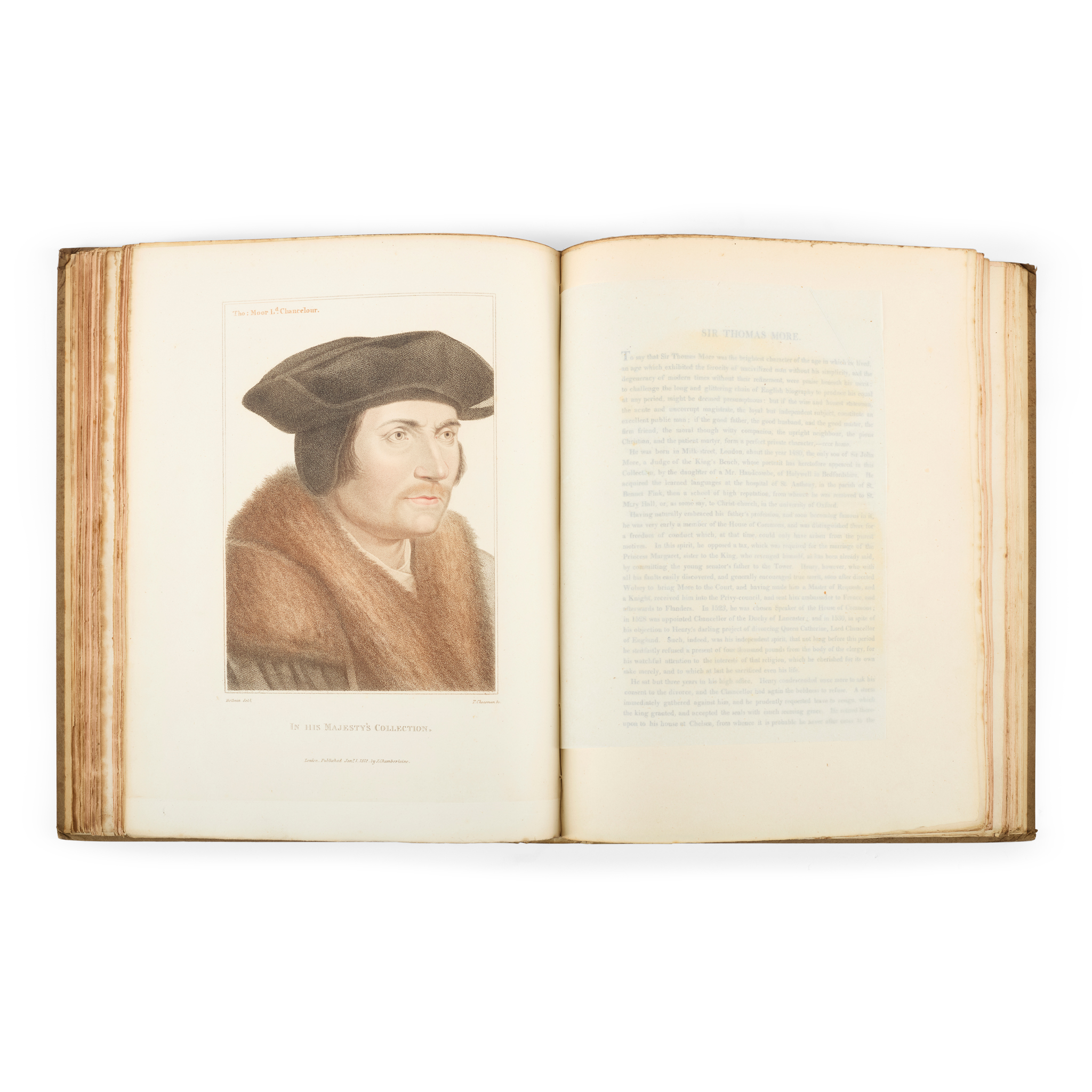 in the Collection of His Majesty, for the Portraits of Illustrious Persons of the Court of Henry VIII. With Biographical Tracts. Published by John Chamberlaine. London: printed by William Bulmer and Co., 1812. Second edition, 4to (34.6 x 26cm), original(?) quarter vellum with paper labels on spine and board, 84 stipple-engraved, colour plates, some on pink paper, with tissue guards, untrimmed, marginal spotting to a few plates [Abbey Life 205 note]