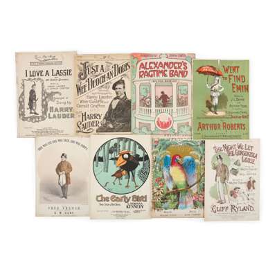 A large collection of music publications with pictorial wrappers (lithographic or photographic), each approx. 35 x 25cm, dating from the 1840s onwards, comprising music hall songs, scores for quadrilles, polkas and other dances, and music by popular artists. Mostly British, many published by Francis, Day & Hunter, J.B Cramer & Co. Ltd. and Charles Sheard & Co., also a quantity of Vaudeville material from the United States and a group of Ragtime publications. Some edges worn, a number with ownership inscriptions and other annotations, a few short taped repairs. Titles include: