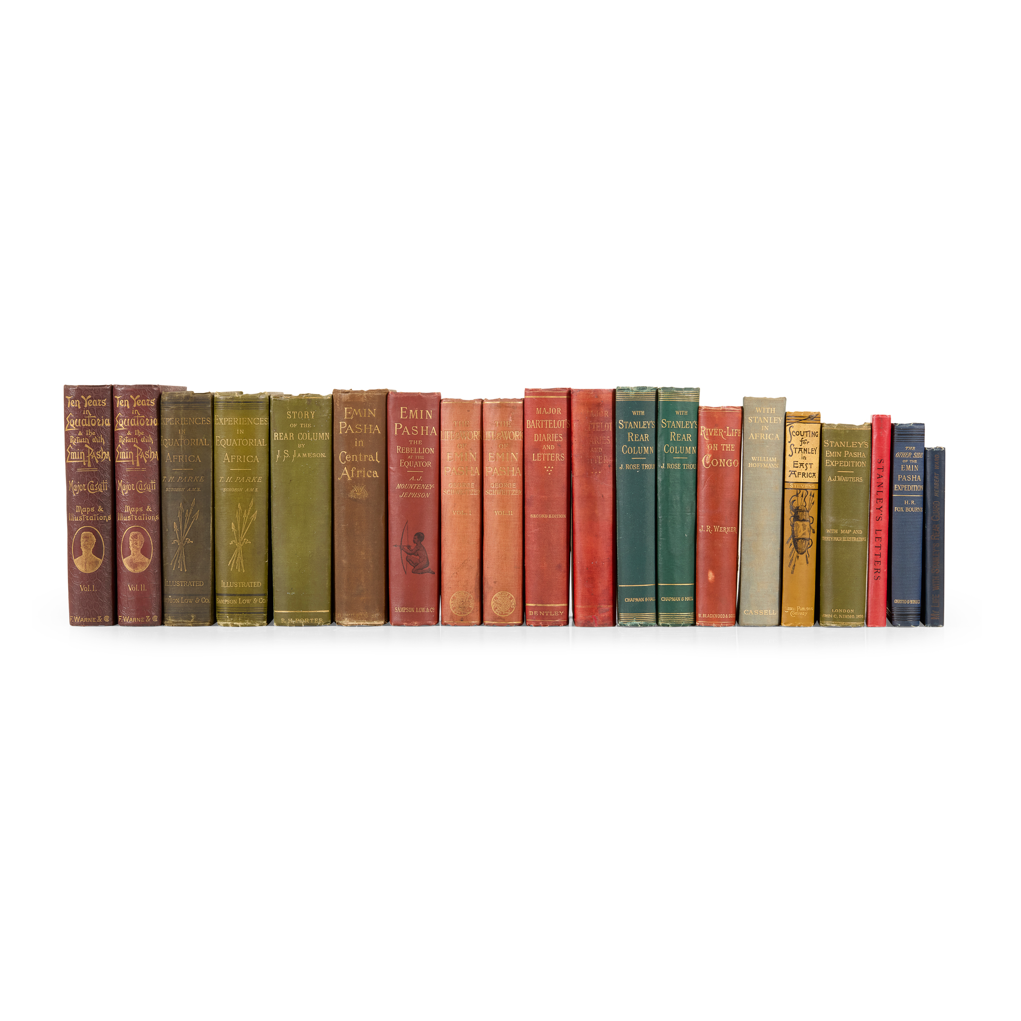 Parke, Thomas Heazle. My Personal Experiences in Equatorial Africa as Medical Officer of the Emin Pasha Relief Expedition. London: Sampson Low, Marston & Company, 1891. First edition, 8vo, original green cloth, lettered in gilt and pictorially decorated, frontispiece, folding colour map in end pocket, plates, publisher's advertisements at end, with book label of bibliographer A.J.A. Symons, author of a work on Emin Pasha, on front pastedown, binding scuffed at edges;