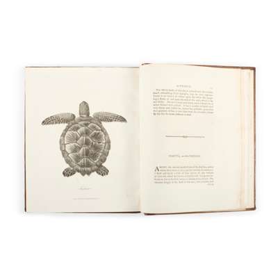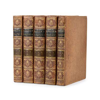 in the Years 1768, 1769, 1770, 1771, 1772, and 1773. Edinburgh: printed by J. Ruthven for G.G.J. and J. Robinson, 1790. First edition, 5 volumes, 4to (29 x 23.3cm), contemporary mottled calf, neatly rebacked with original spines laid down, spines richly gilt in compartments with black calf labels, with half-titles but lacking plate list found in some copies, 3 large engraved folding maps, 58 engraved plates (including 43 natural history specimens in Vol. V), very occasional spotting, corner tips slightly worn [Blackmer 221; ESTC T51608] (5)