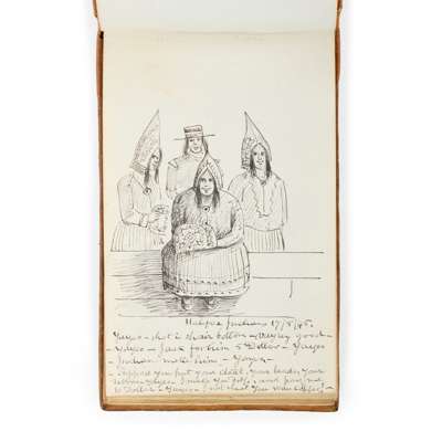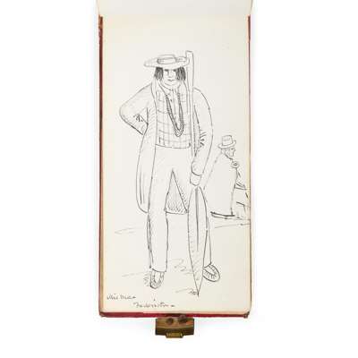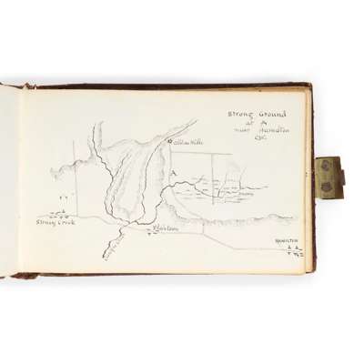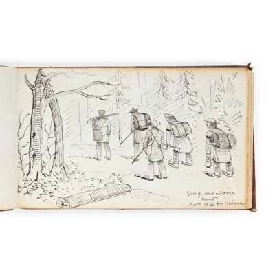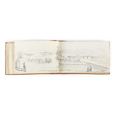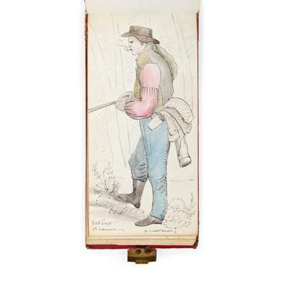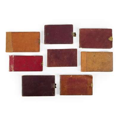 8 albums, all oblong 12mo (various dimensions, approx. 7.5 x 15cm to 9.5 x 16cm), varicoloured leather bindings with brass clasps and catches, numbered in gilt on spines (1, 3, 4, 5, 9, 10, 11, 13), illustrated throughout with sketches in various media (pen and ink, pencil and watercolour; mainly in pen and ink), approx. 650 leaves in total (with sketches to all rectos and frequently also to versos), detailed manuscript captions (often dated), subjects including: views of landscapes, settlements, and homesteads in Quebec, Nova Scotia, New Brunswick, ‘Canada West’ (i.e. Ontario), New York and elsewhere; portraits of Indigenous peoples, soldiers and sailors, local characters and figures of note; depictions of daily life, social occasions, expeditions and excursions, comic mishaps, etc., in civil and military contexts; sketch maps; and more. Notable content in each volume (listed by spine-number) includes: