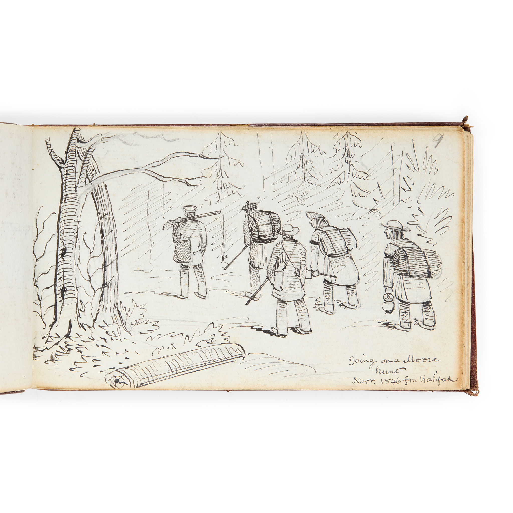 9) (47 leaves; ownership inscription ‘Sir James Edwd Alexander, 14th Halifax, NS, 1st Nov. 46). Moose-hunt near Halifax (several sketches); barrack-room life; social caricatures.