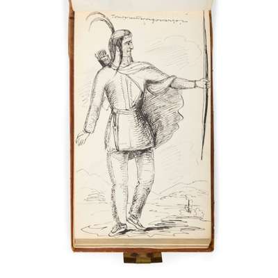 1) (85 leaves; dated 1841-2). Views in New York State (Fort Frederick, Oswego, Lake Onondaga), Canada West (Kingston, Niagara, Hamilton); homesteads and settlements (e.g. Oxford, Canada West); ‘scene of the Battle of Stoney Creek’; portraits, caricatures and social encounters (‘Broadway Swells, 1841’; ‘a loafer of the west’; ‘Street cart, N. York, 41’; ‘Fellow passengers to New York’; ‘encounter with Washington Irving after a party in the dark – he tried to hold back our carriage’; ‘The Kingston pie man’); ships; plan of Mt Pisgah on Lake Erie; full-length portrait of a Native American with a bow (captioned ‘Tonowantowongowango’).