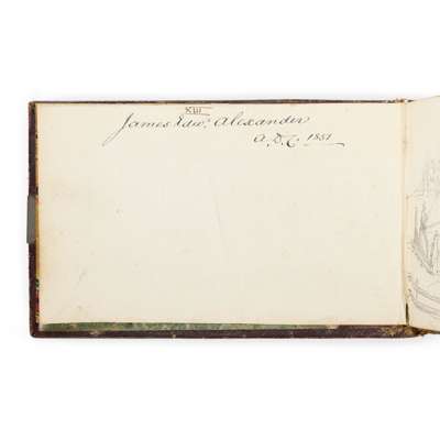 13) (85 leaves; ownership inscription ‘James Edwd Alexander A.D.C., 1851’. Montreal policeman disarming a ‘rioter’; views and residents of St Eustache; ‘Indian warrior’; scenes aboard HMSS Birkenhead (famously wrecked in 1852); views around Lake Chateauguy (including one double-page); birthplace of Alexander’s son Edward Mayne Alexander born (Brunswick Street, Halifax, Nova Scotia); a few Scottish views.