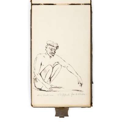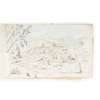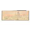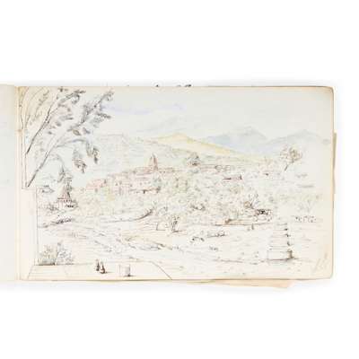 oblong 4to (13.8 22.5cm), cloth, containing 26 sketches (watercolour, pen and ink or pencil), various dimensions, on rectos and versos of 16 leaves of paper mostly interleaved with tissue paper, occasional manuscript captions, sketches date from 1891, including depiction of journey from Gujrat to Bimber [Bhimber] in India 27.9.91 (further depictions of the journey can be found on the loose card leaves inserted in the previous volume), landscapes (pen and watercolour depiction of Rajaore [Rajouri?] in Kashmir, rough pencil sketches of buildings, landscapes, local people, an elephant, various pencil notes at rear, some dampstaining at front and rear of sketchbook, tissue paper creased and stained, lower board stained;