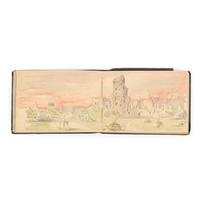 oblong 4to (12.7 x 17.5cm), quarter leather, containing c. 40 sketches (watercolour, pen and ink or pencil), various dimensions, on rectos and versos of 33 leaves of coloured paper (3 leaves blank), occasional manuscript captions, sketches made in the 1880s and possibly later, some double-page, including buildings, landscapes in various locations, in India: Amber, Secundra [Secundra Bagh palace courtyard at Lucknow], Futtehpore [Fatehpur] Sikiri, Agra, Nainital, Jhansi Fort; in Scotland: 78 Highlanders Indian Rebellion Monument (Edinburgh), Lochgilphead;
