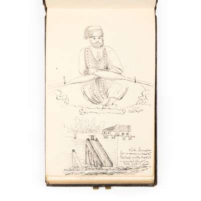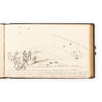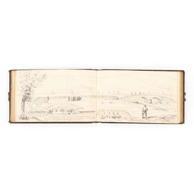 Oblong 12mo (10 x 16.2cm), black roan album, [107 ff.], illustrated throughout with pen-and-ink sketches (and occasional grey wash or blue ink; a few sketches in pencil only), mainly to rectos only but occasionally to versos also (including for 3 double-page panoramas), often with multiple sketches to a page, manuscript captions (frequently dated), including views and scenes in Balaclava, Sevastopol (including the Mamelou redoubt), the Redan, the Malakoff redoubt, Mangup Kale, and Alma, depictions of battles, bombardments, encampments, fortifications, living quarters, ordnance, portraits of named officers and of other ranks (including Sardinian and French troops, cossacks, etc.), graves of British soldiers, Crimean antiquities, a panorama of the Battle of the Chernaya at Traklin Bridge, and more, together with several sketches of views, peoples and objects in Canada and Ireland preceding Alexander's posting, at Gibraltar, North Africa, Malta and Istanbul on the voyage out, at Malta and Spain on the home voyage, and several sketches of views in England, Scotland and Ireland following his return;