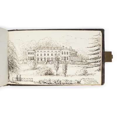 oblong 12mo (8.5 x 15cm), contemporary black straight-grain morocco album with brass clasp and catch, numbered ‘18’ on spine in gilt, approx. 60 ff., sketches throughout, mainly in pen and ink, a few in pencil, some with added grey wash, largely to rectos only, a few to versos, manuscript captions, the subjects including views of castles, country houses, towns and rural areas (e.g. Lismore, Kilcolman, Mallow, Waterford, Tramore, etc.), excursions and genre scenes (e.g. archery meet near Mount Leinster, exploring a cromlech near Kilmaclenine castle), portraits, and miscellaneous sketches and caricatures (a shrine to Ganesha, dated 1824, presumably a recollection of Alexander’s service in Burma; ‘There was an Old Man of Jamaica’ after Edward Lear; salmon spearing in New Brunswick, Canada), ownership inscription ‘Sir James Edwd Alexander, 1 D.B, Fermoy, Jany- 1858’;