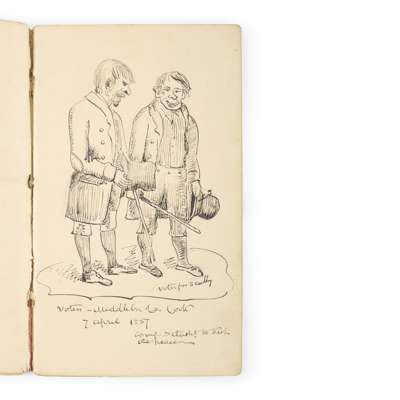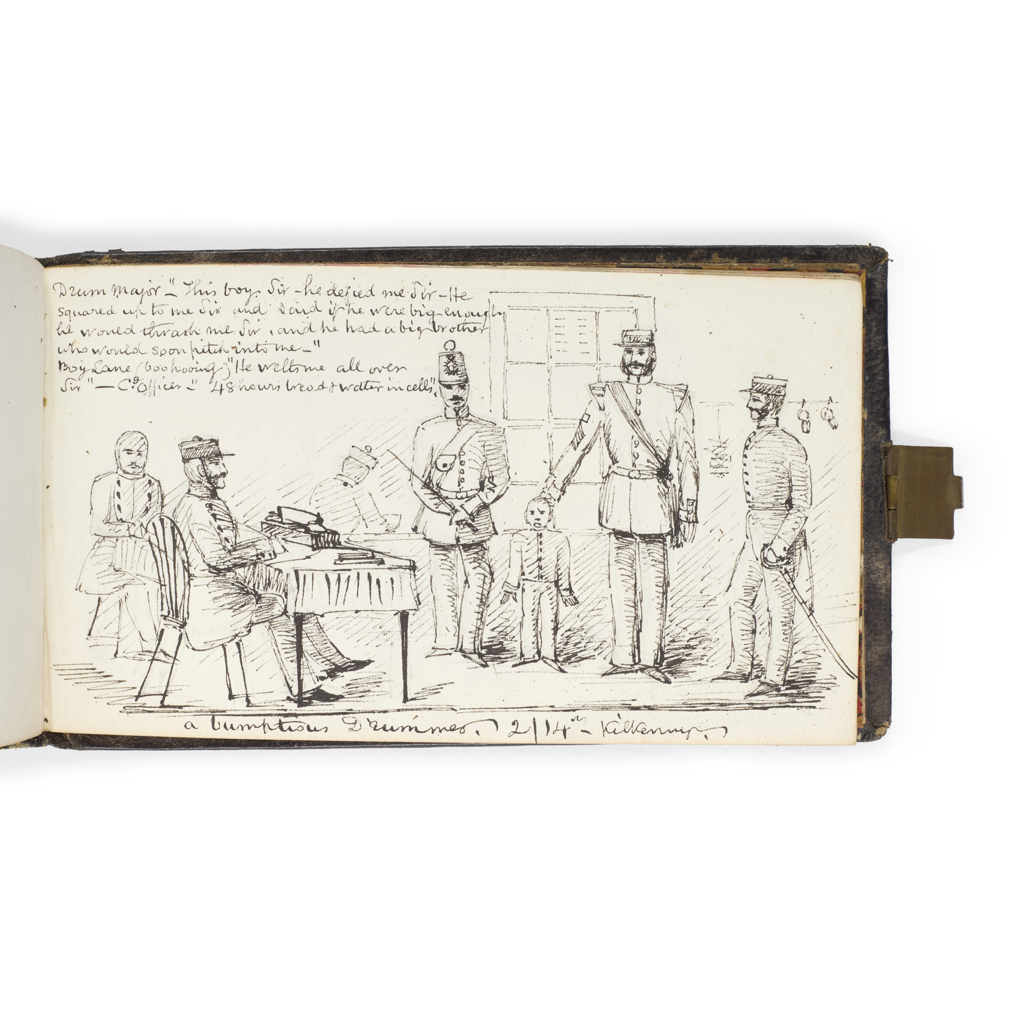 8vo (18 x 11cm), contemporary red pebble-grain cloth album, approx. 40 pp., sketches throughout, mainly pen and ink (a few in pencil), to rectos only, manuscript captions, subjects including: scenes and caricatures of Irish life (e.g. ‘a tasty hat we saw in Cork’, ‘Voters, Middleton, Co. Cork, 7th April 1857, Camp detach to keep the peace’, couples dancing, etc.) and of military life and drill, portraits of figures of various social ranks (e.g. Earl of Meath, Earl of Carlisle the Lord Lieutenant, ‘Mr Jukes Geologist’, ‘General Chesney [possibly Francis Rawdon Chesney], ‘Professor Sullivan’ of Trinity College Dublin, various members of the British Association, ‘Sergeant O’Dwyer of the Cork Militia’, ‘Waiter at Tallow: ‘We’ve none o’ that!’', ‘Killarney boatman’, etc.), views (Royal Hospital Dublin, Kinsale), and similar, ownership inscription ‘Sir J. E. Alexander 1857’;