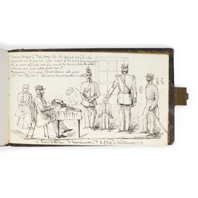 oblong 12mo (8.6 x 15.5cm), contemporary black hard-grain morocco album with white metal clasp and catch, numbered ‘19’ on spine in gilt, approx., 80 ff., with pen and ink sketches throughout (often several to a page, mainly to rectos only, a few embellished with coloured pencil or grey wash), manuscript captions, the subjects including views (of towns, landscapes, and important buildings, e.g. River Dargle, Chair of Kildare, Wicklow, Mullingar, Glendalough, the seat of the Marquis of Drogheda at Moore Abbey, etc.), sketches and caricatures of people, scenes and objects of interest from military and civilian life (e.g. ‘Paddy Byrne, near Ballysaxe, landlord of a public’, ‘comet as seen at Kilkenny, Oct 1858’, ‘the crooked legged man of Holywood’, pheasant shooting in Garbally, antiquities), occasional sketches from other episodes and places from Alexander’s life (including the Crimean war, the family seat at Westerton, Dumbarton, Ben Lomond, Prince Albert at the opening of the British Scientific Association in 1859, a West Indian soldier, ‘An Arab of Aden’, etc.), with ownership inscription ‘Colonel Sir James Edwd. Alexander, 14 Regiment, Jany 1859, Dublin’;