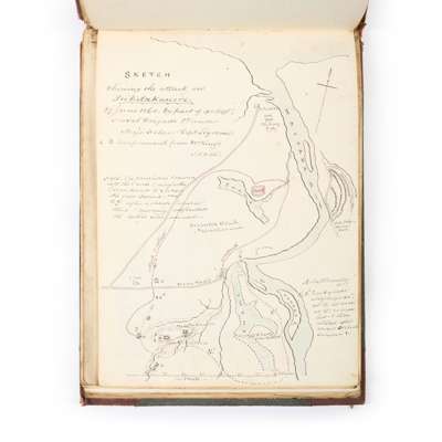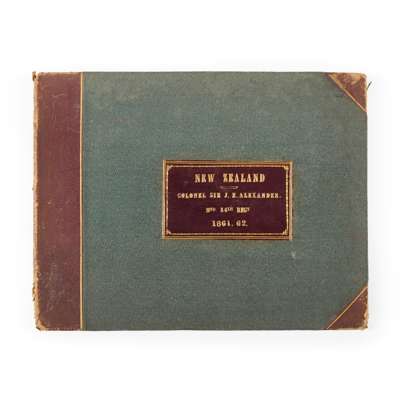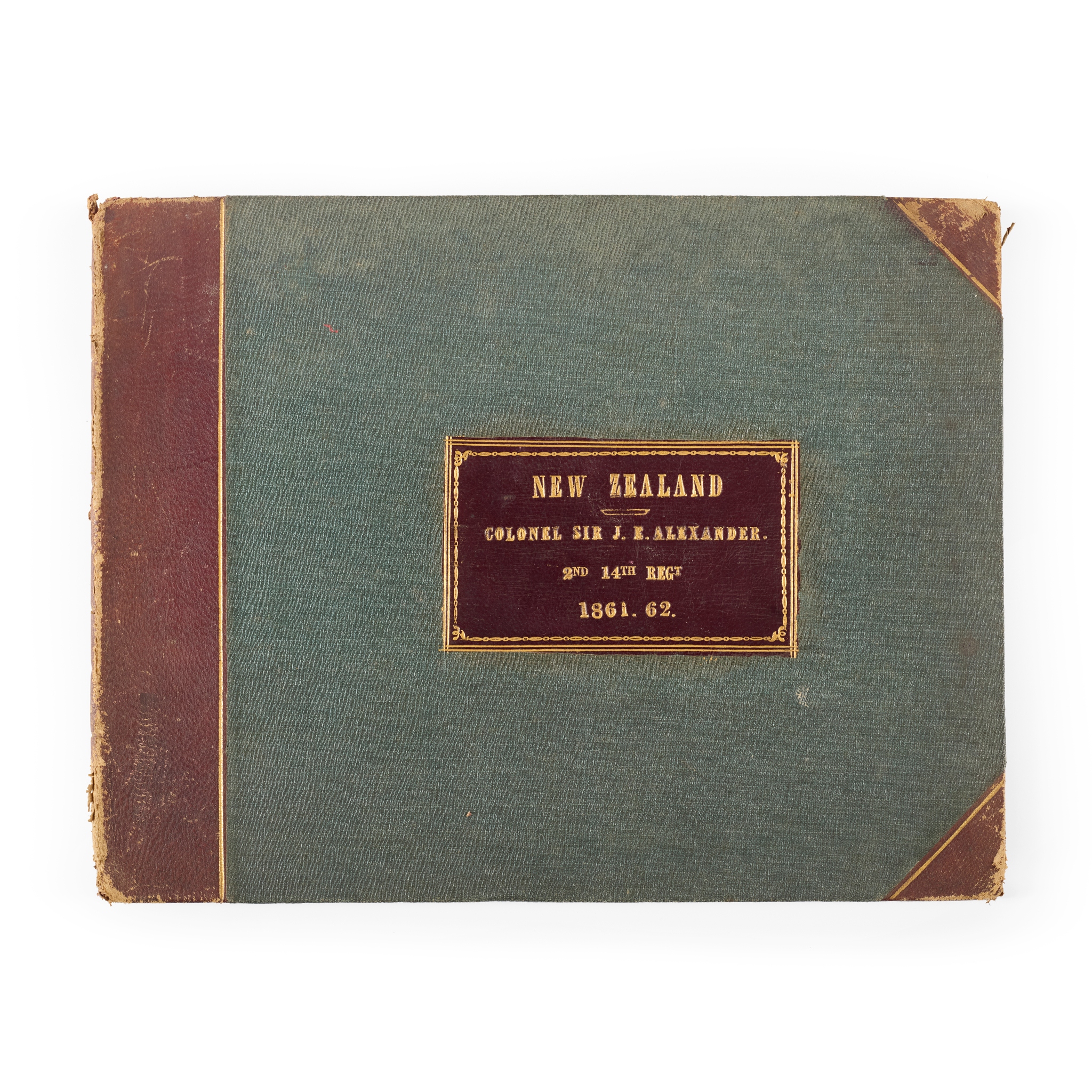 oblong 4to (18.6 x 24.5cm), reddish-brown half roan album, cloth covers, black leather label to front (lettered ‘New Zealand, Colonel Sir J. E. Alexander, 2nd 14th Regt, 1861. 62’ in gilt), [45] ff., comprising views (including Te Arei pah, camp at Waitara, Mount Egmont, a Maori kainga, Castle Point, camp at Otahuhu, various scenes on the Waitara river and Waikato rivers and at Manekau, ‘Wareka hill, stormed by Captain Cracroft, H.M.S. Niger, 1860', Wellington, Hutt River, etc.), a battle scene ('Repulse of Maoori attack on No. 3 Redoubt'), ethnographic studies (including a full-length portrait of Maori chief E Puni), and several maps and battle plans (including a general plan of the ‘Seat of War’, Waireka, defences at Puketakauere pa, the attack on Puketakauere, 'Kaihihi, sketch showing the positions of the pahs attacked', Matarikoriko, ‘Sketch of Waireka-Hill shewing the action with the Maories’, and more), manuscript captions throughout (often dated), mainly in pen-and-ink with touches of pencil and frequent use of coloured washes, a few in pencil, on rectos only (except for one leaf with pen-and-ink sketch captioned ‘Maori Paddling’ on verso)