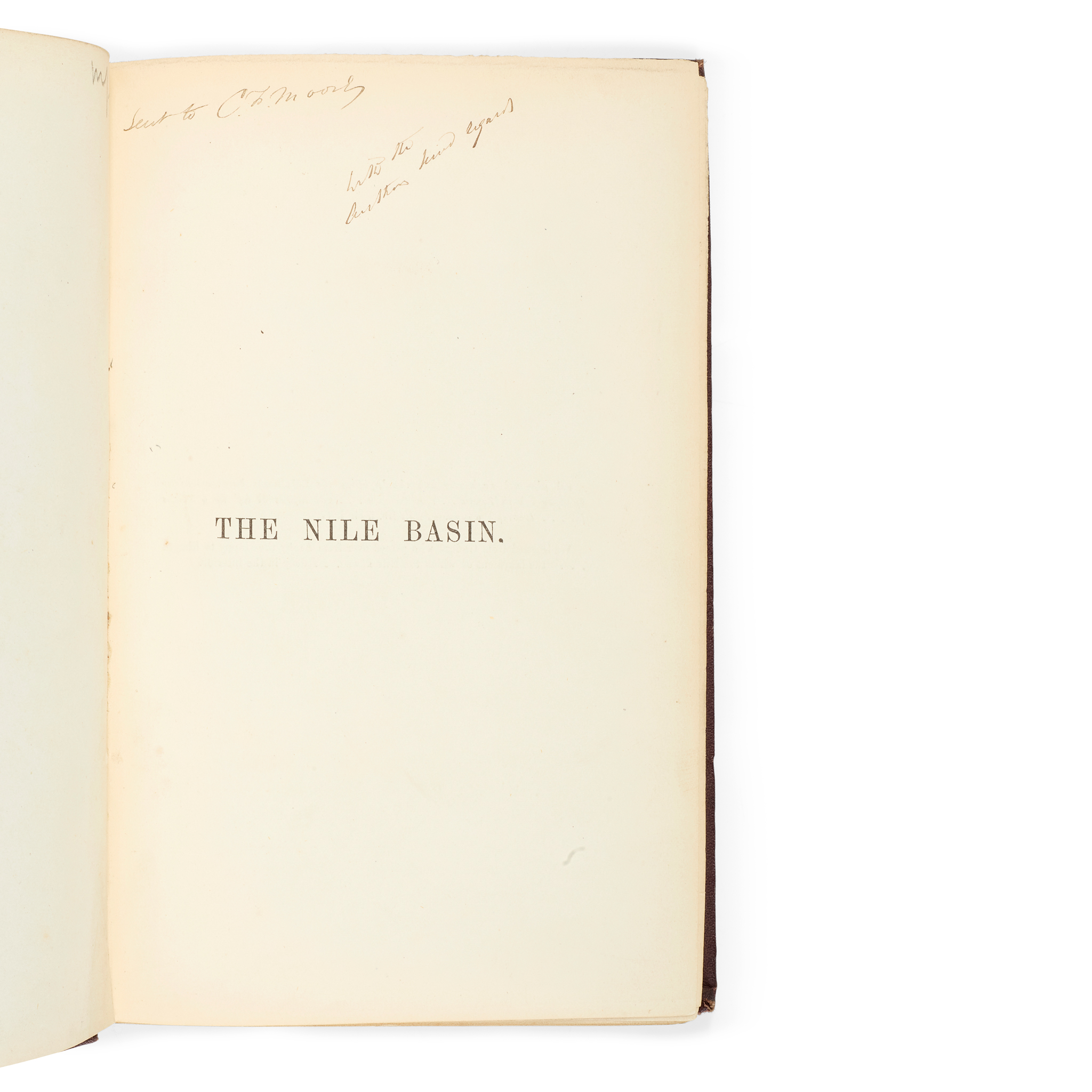 Part I. Showing Tanganyika to be Ptolemy's Western Lake Reservoir … Part II. Captain Speke's Discovery of the Source of the Nile. London: Tinsley Brothers, 1864. First edition, presentation copy, inscribed ‘with the authors kind regards' on the half-title, additionally inscribed ‘sent to C H Moore’ and ‘C H Moore' on the half-title and title-page respectively, 8vo, [4] 199 pp., original sand-grain maroon cloth, spine lettered in gilt, blind panels to covers, 3 lithographic maps, 4 pp. advertisements to rear, fraying to head and foot of spine, front joint partly split, front inner hinge cracked, bookplate, pencilled ownership inscription to front pastedown