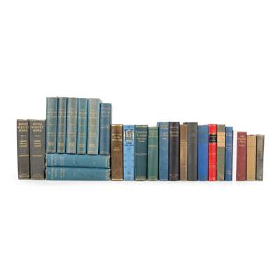 Together with approximately 80 similar works (these not collated), including: Hakluyt Society, The True History of the Conquest of New Spain. By Bernal Diaz Del Castillo … From the only exact copy made of the original manuscript. London: Printed for the Hakluyt Society, 1908-12 (5 volumes including map case, imperfect, one map missing); Fridtjof Nansen, In Northern Mists. London: Heinemann, 1911 (2 volumes, first edition, 8vo, original cloth, boards scuffed, edges and corners rubbed); ibid., The First Crossing of Greenland, London: Longmans, Green, and Co., 1890 (2 volumes, first edition, 8vo, original illustrated cloth, owner's name in ink and pencil note to endpaper vol. I, boards scuffed, edges and corners rubbed, foxing); H. Swainson Cowper, Through Turkish Arabia. London: W. H. Allen & Co., Limited, 1894 (first edition, 8vo, original cloth, presentation label to pastedown, boards scuffed, edges and corners rubbed, dampstaining, no maps or plates); Donald B Macmillan, Four Years in the White North, New York: Harper & Brothers Publishers, 1918 (first edition, 8vo, later quarter calf, top edge gilt the others uncut; A. Henry Savage Landor, Tibet & Nepal Painted and Described … London: A. & C. Black, 1905 (first edition, 8vo, original decorative gilt tooled cloth, remains of label and pencil notation to front pastedown and pencil inscription to free endpaper, pencil notations to front pastedown and front and rear endpapers, joints and head of spine rubbed); Ibid. Across Widest Africa, London: Hurst and Blackett Ltd., 1907 (2 volumes, first edition, 8vo, original cloth, ownership labels to front endpapers, pencil notations to front pastedown and endpaper vol. I, uncut on 2 edges, dampstaining); R. H. H. Macaulay, Trading into Hudson's Bay., Winnipeg: Hudson's Bay Company, 1934 (4to, original wrappers); and approx. 50 further Hakluyt Society volumes;