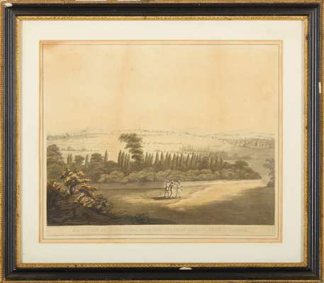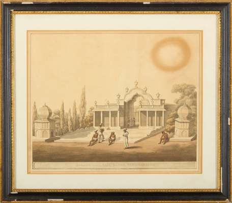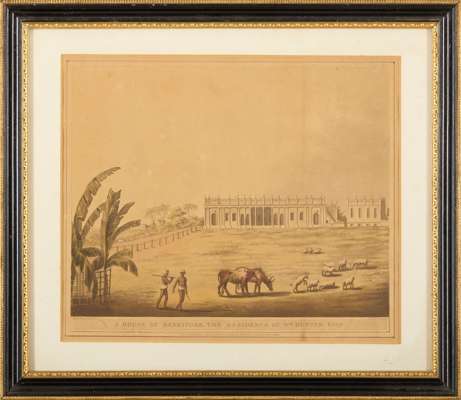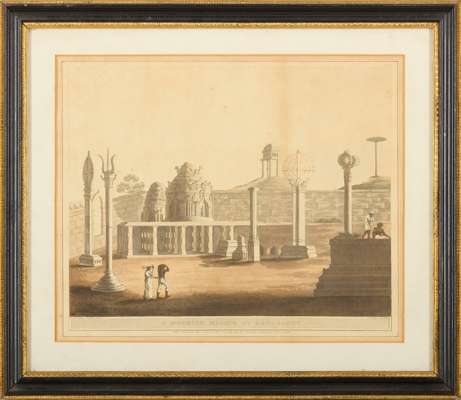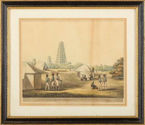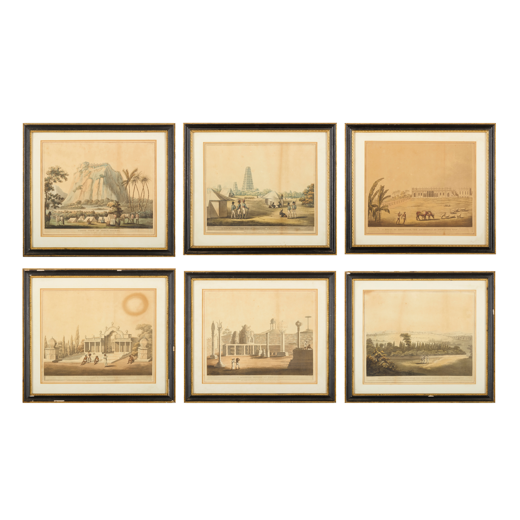 London: Edw[ar]d Orme, 1804-5. 6 hand-coloured aquatints after James Hunter, separately mounted, framed and glazed, mount apertures 27.5 x 34cm, titles comprise: No. 6, Garden Gate, Laul Baugh, Seringapatam; No. 19, A Moorish Mosque at Bangalore; No. 32, North View of Shole Ghurry; No. 36, A View from the Royal Artillery Encampment, Conjeveram; No. 40, A House at Bankipore, the Residence of Wm. Hunter Esqr.; [Unnumbered], East View of Bangalore, with the Cypress Garden, from a Pagoda [cf. Abbey Travel 424] (6)