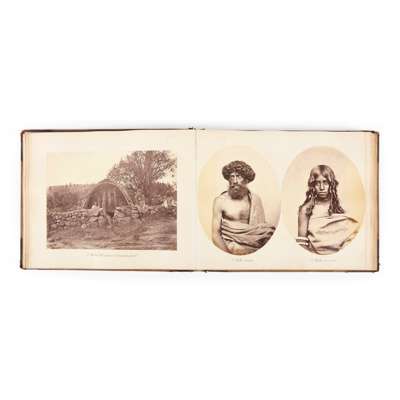 Oblong folio album (30 x 27cm), maroon half skiver binding, containing 50 albumen print photographs (most between approx. 18 x 21cm and 22 x 28cm., a few smaller, 14 x 10cm), mounted to rectos and versos of linen-hinges stiff card leaves with gilt edges, contemporary manuscript captions to mounts (often dated), the photographs including ethnographic studies ('A Toda hut near Ootacamund’; ‘A Toda man’ and ‘A Toda woman’, these oval-form, 23.5 x 18.5cm; ‘A Native priest’; ‘A Coolie woman;’ ‘Maskers during the Mohurrum’; ‘A Chatty shop’; ‘Dirzies’; ‘Grinding gram’ ‘Snake charmers and jugglers’, etc.), ‘The Maharaja of Mysore and his Relatives’, ‘Palace of the Maharajah on his wedding day June 1878’, street scenes (‘A wayside scene, Kullar’; ‘St James’ Bazaar Secunderabad'), Indian architecture ('Mool Ali'; ‘The Fort Golconda’; ‘Tomb at Golconda’), British military, civil and landscape architecture ('The Entrenchment, Trimulgherry'; ‘The “Kirk” Secunderabad’; ‘The Lal Bagh Bangalore, 1878’), British recreation (including several scenes of the Secunderabad hunt, with native attendants, and portraits of social groups, e.g. ‘A picnic group Coonoor, 1877’), views (including several of Coonoor), British soldiers (parades and group portraits, e.g. ‘Officers R.A. Secunderabad Feby 1878’), with a few additional studio photographs of Suez and Ismailia to front and rear, spine worn, front board partly detached.