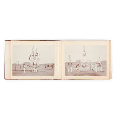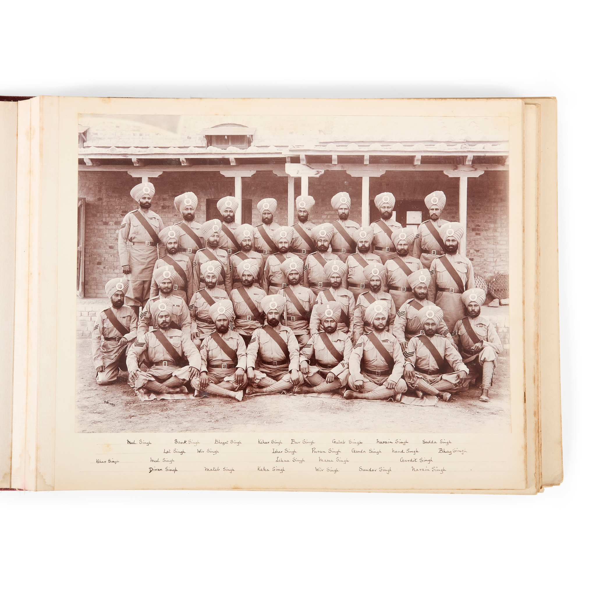 17 large-format photographs (approx. 21 x 29cm), including 6 formal group portraits solely or predominantly of Sikh soldiers (several of these with studio's name of Holmes, i.e. W. D. Holmes, in the negative; 2 with manuscript captions to mount naming each sitter), 2 group portraits of a mix of British and Sikh soldiers (one with caption and studio's signature in negative, '2nd Class School of Musketry, Pachmarhi, 1910, H. Hands & Son), 2 of Sikh soldiers performing acrobatics, 3 of parades (two with manuscript captions: ‘45th Rattray’s Sikhs marching past the Sirdar Inayat Ullah, son of the Amir of Afghanistan, January 1905' and ‘45th Rattray’s Sikhs marching past the Prince of Wales, Dec. 1906'), the remaining large-format photographs being group portraits of British soldiers only (these with manuscript captions, e.g. Kasauli Sept 1097', Nowshera Feb. 1908'); and over 60 smaller photographs (various dimensions, mainly 8 x 12cm or similar, several larger, e.g. 9.5 x 29cm, 11 x 16.5cm), including informal portraits of Sikh soldiers, camp life, parades, mountain scenery, etc.); together with a small number of loose photographs, album block detached from covers.