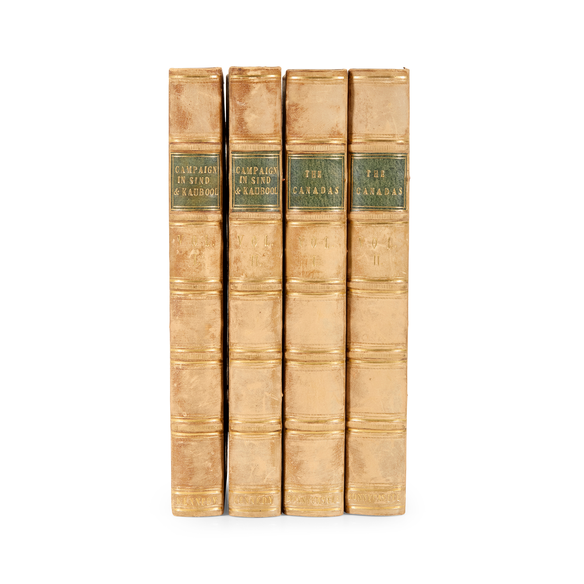 Bonnycastle, Sir Richard H. The Canada in 1841. London: Henry Colburn, 1841. First edition, 2 volumes, large 12mo (19 x 11.4cm), xii [2[ 348, viii 338 pp., contemporary red half calf uniform with the preceding work, lithographic frontispieces, lithographic folding map, wood-engraved vignettes to title-pages and text, list of illustrations to volume 1, spines sunned, spotting to endpapers and outer leaves (4)