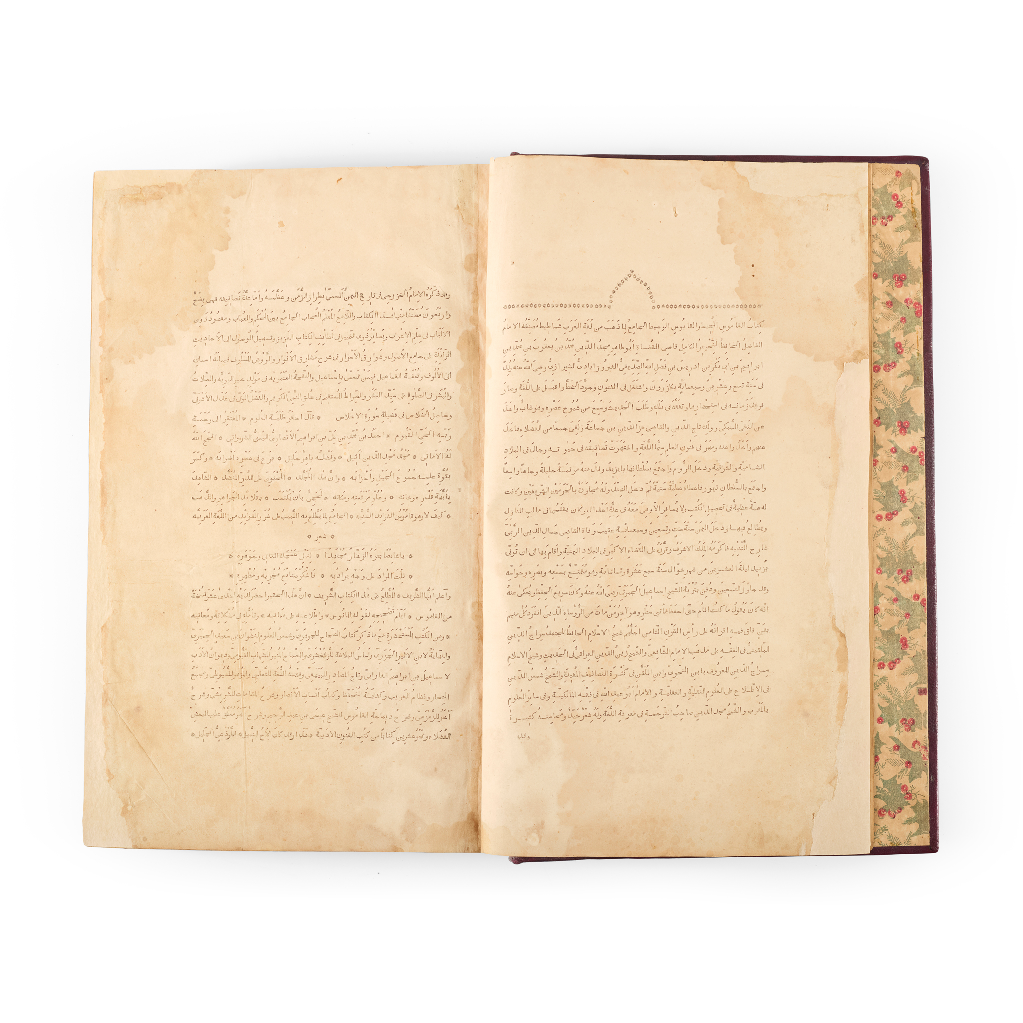 Calcutta: printed by Ahmad bin Muhammad bin ‘Ali al-Ansari al-Yamani al-Shirwani, beginning of Muharram 1230 AH - 25 Rabi’ al-Thani 1232 AH [i.e. 1814-17 CE]. 4 parts in 2 volumes, folio (38 x 23cm), [5] 2-541 [542-5] 546-1039, 1042-1486 [1487-9] 1490-1978 pp., collates pi2 A-Z2 1A-9Z2, 10A-19A2 (-19A2, presumed blank; register includes both I and J, and U and W but no V), recent red morocco with earlier leather panels bearing gilt arms of the College of Fort William relaid to covers, manuscript catch-titles to fore edges, variable browning, volume 1 with damp-staining to outer leaves, marginal paper restoration to first two quires (pi-A) and final leaf, light marginal worming to pp. 1-150 (initially two holes, reducing to one), infilled worming to fore margins of final few leaves, a few small burn-holes (e.g. to 2C2, 5O2 and 6B2) occasionally obscuring a letter or word, volume 2 with damp-staining to gutter and corners and worming to corners of initial quires, both gradually reducing, 10A-B with paper restoration lower fore corners, following quires up to 10F with infill to worm-tracks, marginal worming recurring in last few quires, small closed tear in text of 18Z1, final leaf 19A1 strengthened in gutter (2)