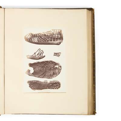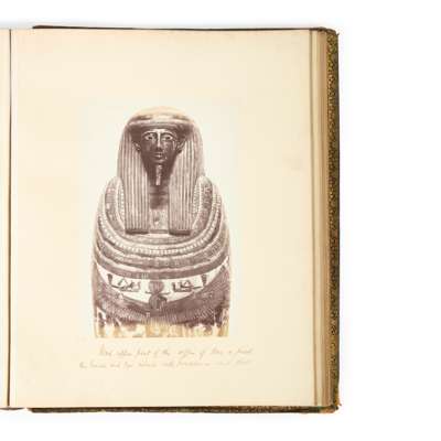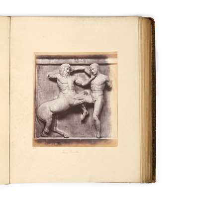 London: W.A. Mansell and Co., 1872. Parts II, IV, V and VI only (of 7), folio, full morocco gilt, gilt edges, 436 albumen print photographs (various sizes between 25-28 x 20-22cm) on card mounts (43.5 x 34.5cm) in bound volumes, each mount numbered in pencil corresponding to the numbers in the separately issued printed catalogue ('Catalogue of a Series of Photographs from the Collections of the British Museum') of the photographs of all 7 parts; consisting of: part II, vol. 1, Egyptian Antiquities, 61 prints, with manuscript inscriptions on mounts based on printed catalogue descriptions; part II, vol. 2, Egyptian Antiquities, 56 prints; part IV, vol. 1, Grecian Antiquities [including the Elgin Marbles], 102 prints; Part IV, vol. 2, Grecian Antiquities, 74 prints; part V, Etruscan and Roman Antiquities, 97 prints; part VI, Antiquities of Britain, 46 prints; bindings worn and rubbed on spines and board edges, endpapers and title pages with heavy dust soiling, individual mounts generally clean with some occasional dust soiling, slight age-related toning of prints [Gernsheim, Incunabula of British Photographic Literature, 547] (6)
