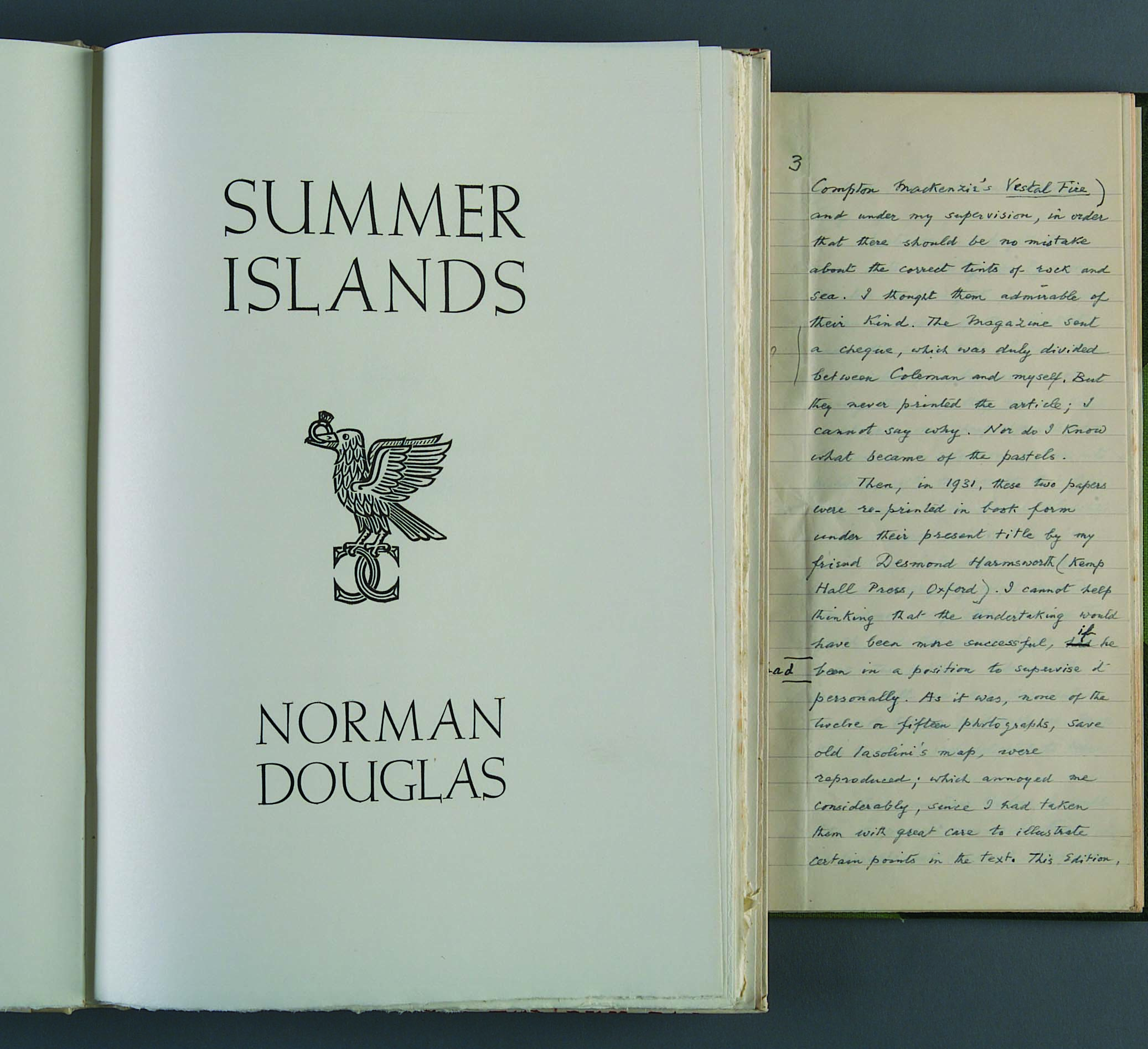 Original holograph manuscript of Norman Douglas's , written in columns on 8 ruled pages, with a typed titlepage, half green morocco by Sangorski & Sutcliffe. 4to., 1942