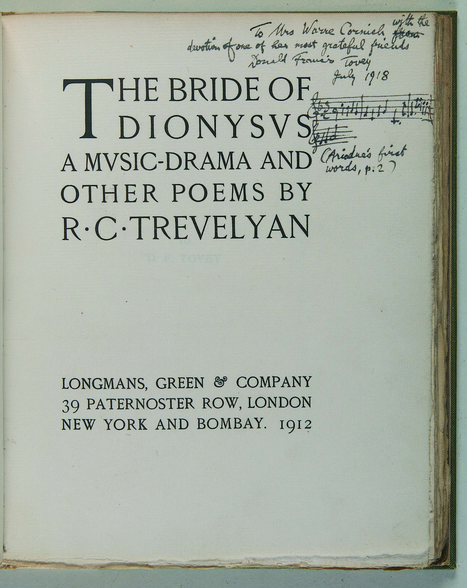 Note: With a presentation inscription from the composer Donald Tovey on the title page. With numerous pencilled annotations probably in Tovey's hand. Sir Donald Tovey, distinguished musical scholar and composer and Reid Professor of Music at the University of Edinburgh, composed prolifically during his first Oxford days and in the following years, but after 1918, his only major works were the 1935 Cello concerto composed for Pablo Cassalls and his opera The Bride of Dionysius upon which he had been working since 1907 and which was eventually first performed in 1929