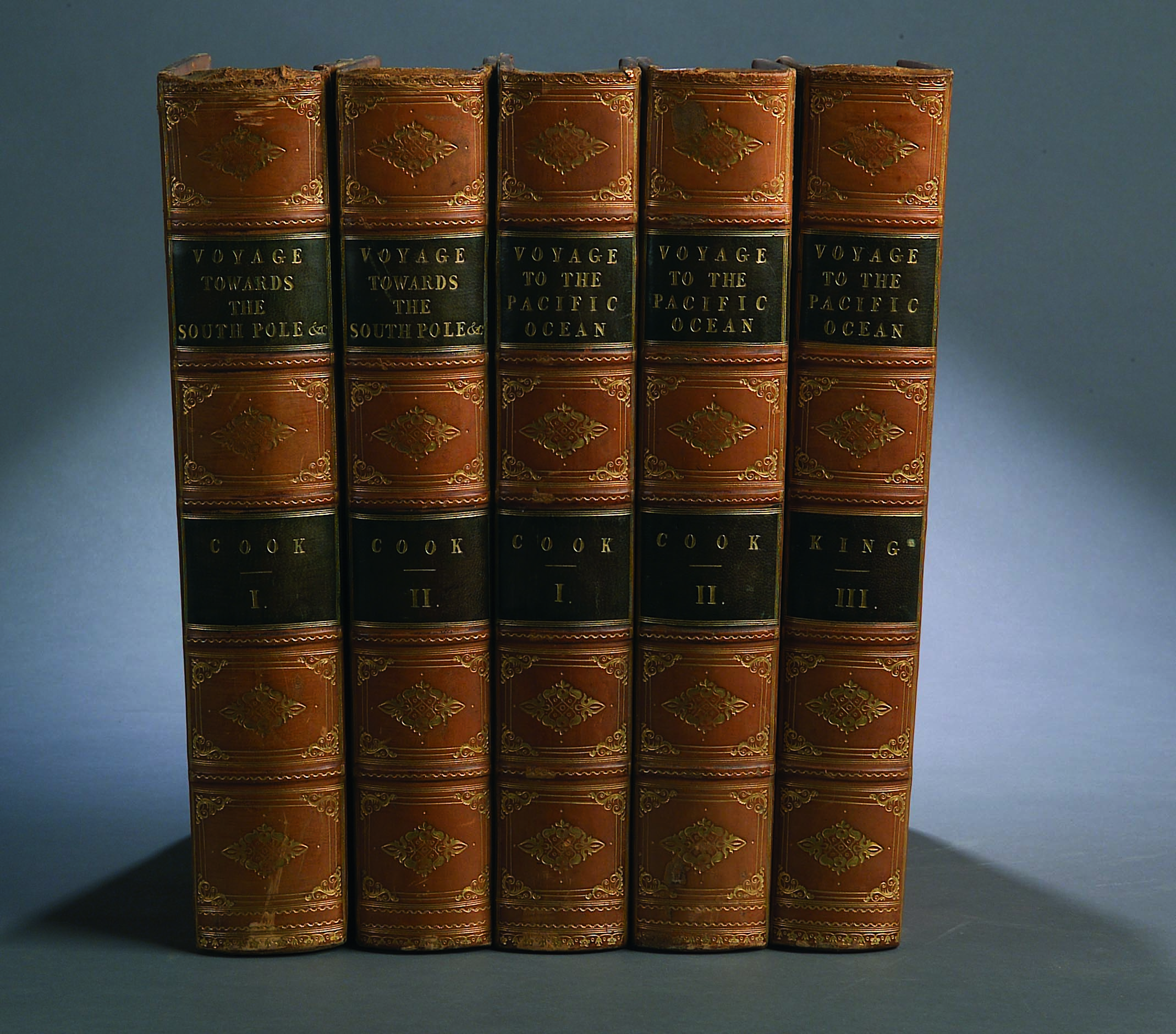 Performed in His Majesty's ship the Resolution and Adventure, in the years 1772, 1773, 1774 and 1775, written by James Cook, Commander of the Resolution. In which is included, Captain Furneaux's Narrative of his proceedings in the adventure during the separation of the ships....1st edition, 2 volumes, volume 1 with engraved port. frontis. of Captain Cook, a large fldg. chart of the Southern Hemisphere and 35 engraved plates of charts, portraits, events, a number of which are either double or fldg.; volume 2 with 27 similar plates and fldg. language table, contemporary light tan calf, covers with gilt ruled and blind tooled border, spine decorated gilt in compartments, dark green leather lettering pieces, occasional offsetting from the plates, small tear in the lower margin of p 299 (no loss), otherwise a suberb copy with margins, 4to, London, 1777