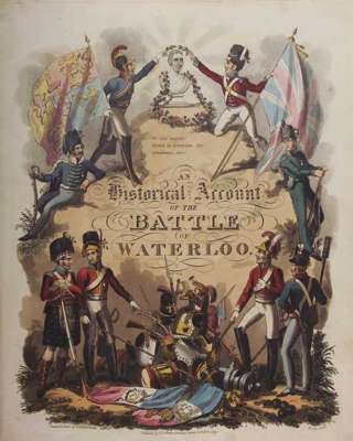 An historical account of the campaign in the Netherlands, in 1815, under His Grace The Duke Of Wellington, and Marshal Prince Blucher, comprising the battles of Ligny, Quatre Bras, and Waterloo ... 1st edition, 2 fldg. maps (including 1 col.), 28 hand coloured plates (including frontis., titlepage and 2 fldg. plates) by George Cruikshank, original paper boards, fore-edges uncut, backstrip almost detached, extremities worn, titlepage and some other leaves slightly spotted and discoloured , some of the fldg. plates with splits, 4to., London: Colburn, 1817