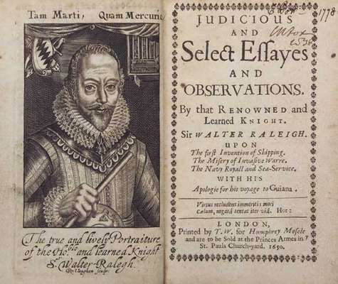 Judicious and select essayes and observations ... upon The first invention of shipping. The misery of invasive warre. The Navy Royall and sea-service. With his Apologie for his voyage to Guiana ... 4 parts in 1 vol., engraved port. frontis., pp. [x], [viii] of books printed for Humphrey Moseley, 42; [ii], [65], verso blank, 1 blank leaf; [ii], 46; [ii], 69, verso blank, contemporary calf, rubbed, joints weak, pastedowns free, inscription dated 1778 on the titlepage, 8vo., London: T.W. for Humphrey Moseley, 1650