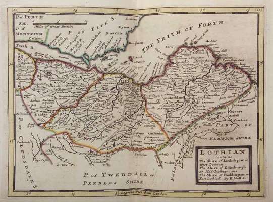Scotland delineated: or thirty six new and correct maps of North Britain ... carefully composed by Herman Moll, geographer, from Gordonius a Straloch, Tim. Pont, and John Adair ... 36 doublepage or folding, engraved maps, hand coloured in outline, and guarded, contemporary half calf, marbled boards, rubbed, some light occasional spotting and a small split at the lower inner fold of map 25, 4to., London: Thomas Bowles, 1745
