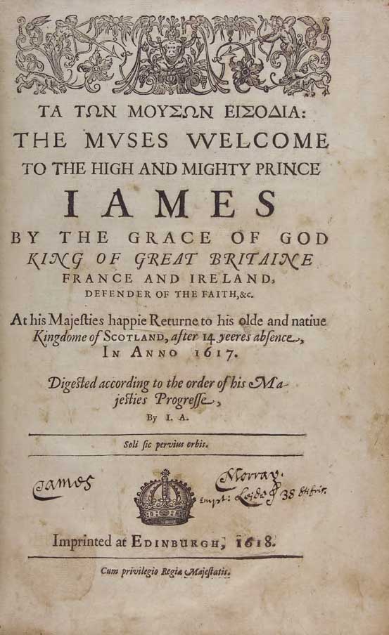 Greek title: Ta ton mouson eisodia. The muses welcome to the High and Mighty Prince James ... at his Majesties happie returne to his olde and native Kingdome of Scotland, after 14 yeeres absence in anno 1617 ... [bound with] Greek title: Ta ton mouson exodia. Planctus, & vota musarum in augustissimi monarchae Iacobi ... recessu e Scotia in Angliam, Augusti 4 anno 1617 ... 2 works in 1 volume, port. woodcut frontis. to the first work of King James, the second work with the final blank leaf, later sprinkled calf, titlepage a little dusty, light water staining throughout, very slight worming at the lower inner margin, Edinburgh: no printer, 1618 [the second work, Edinburgh: excudebat Andreas Hart, 1618]