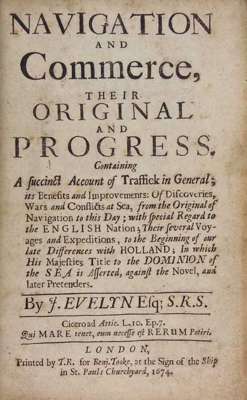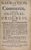Navigation and commerce, their original and progress ... 1st edition, pp. [v], verso blank, 120, [xii], [i] of errata, verso blank, [ii] of books sold by Benjamin Tooke, later full calf, double gilt rule, spine decorated gilt in compartments, heads and tail a little worn, slight paper discolouration throughout, 8vo., London: printed by T.R. for Benj. Tooke, 1674