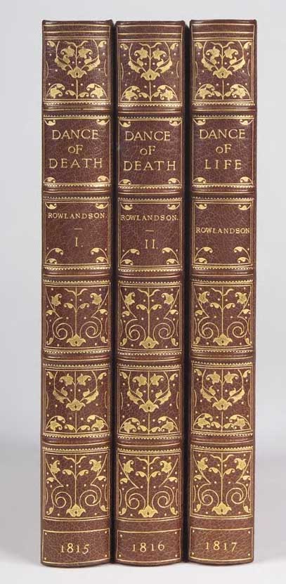 The English Dance of death, from the designs of Thomas Rowlandson, with metrical illustrations, by the author of "Doctor Syntax" [and] The Dance of life, a poem by the author of "Doctor Syntax"; illustrated with coloured engravings by Thomas Rowlandson ... 3 volumes, 1st edition, 2nd issue [i.e. in book form], hand coloured frontis. and title to each work, 96 hand coloured engraved plates, full polished crushed brown morocco, covers with triple gilt fillets, spines decorated gilt in compartments, t.e.g., others uncut, inner gilt dentelles, by Morrell, printed titlepage of vol. 1 slightly spotted, some offsetting from the plates, a few plates with some light spotting, small marginal split to plate to face p. 82 in vol. 2 (not affecting engraving), fore-edges with some foxing, 8vo., London: Ackermann, 1815-17 [3]