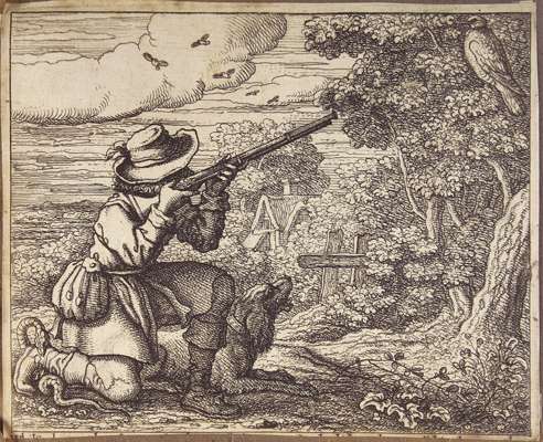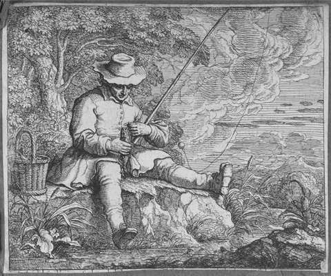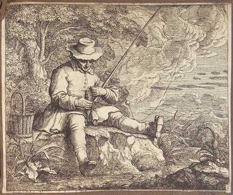Note: Francis Barlow was renowned for his pictures of country life and sport. His Aesop "is one of the chief English illustrated books ... that makes him the father of English book illustration" (Hodnett). Hodnett describes the engraving of the fisherman which we illustrate as making clear that "that river fishing can never be much more elaborate than it seems in the idyllic scene of the single fisherman with a pole in Barlow's Aesop ... .the book is one of the first of the long line of British illustrated sporting books ... It is also one of the first of English illustrated books to use the English countryside in an intimate way that will become the idiom of countless later books."